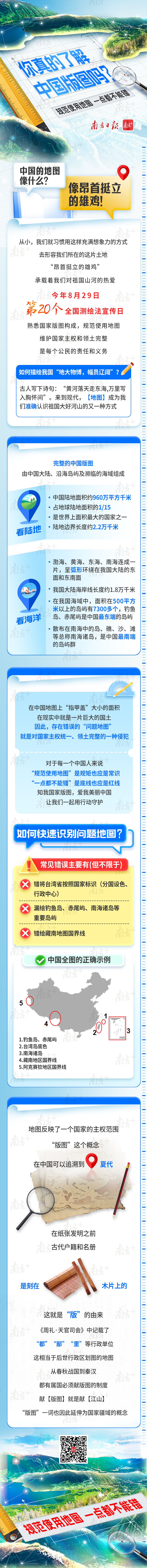 今年8月29日是第20个全国测绘法宣传日。活动主题为“规范使用地图 一点都不能错”。让我们通过一组长图,一起来认识国家版图,增强版图意识,学会正确使用地图和识别“问题地图”。