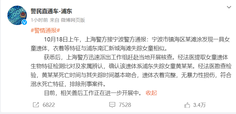 据报道,10月18日上午,上海警方接宁波警方通报:宁波市镇海区某滩涂发现一具女童遗体,衣着等特征与浦东南汇新城海滩失踪女童相似。经确认,该遗体系浦东失踪女童黄某某。