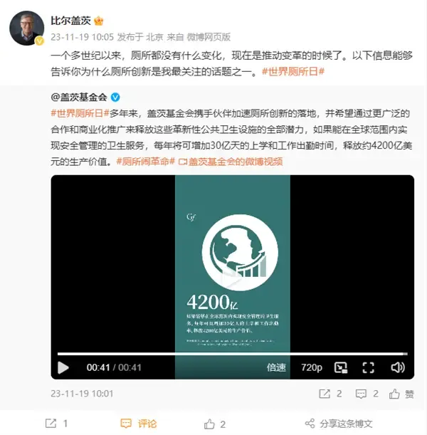 值得一提的是,今日,比尔·盖茨还转发了“盖茨基金会”一条微博表示,“一个多世纪以来,厕所都没有什么变化,现在是推动变革的时候了。以下信息能够告诉你为什么厕所创新是我最关注的话题之一。”
