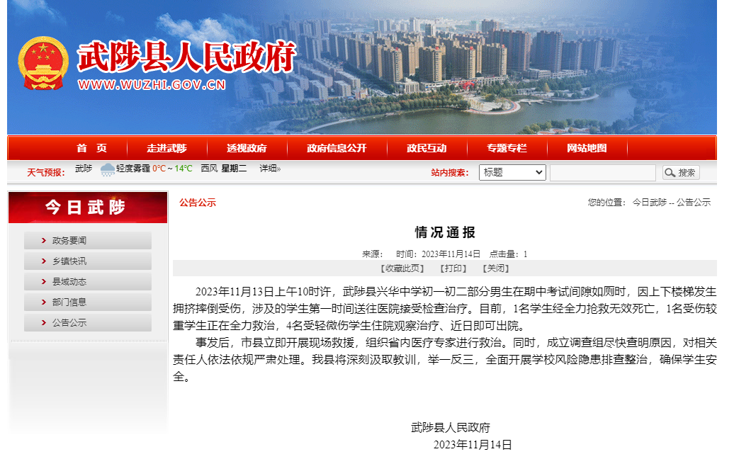 武陟县人民政府通报,2023年11月13日上午10时许,武陟县兴华中学初一初二部分男生在期中考试间隙如厕时,因上下楼梯发生拥挤摔倒受伤,涉及的学生第一时间送往医院接受检查治疗。目前,1名学生经全力抢救无效死亡,1名受伤较重学生正在全力救治,4名受轻微伤学生住院观察治疗、近日即可出院。