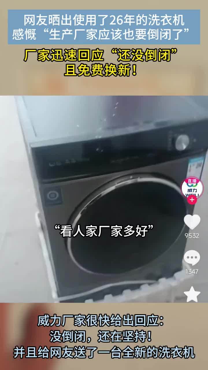 网友晒出使用了26年的洗衣机,感慨“生产厂家应该也要倒闭了”,厂家迅速回应“还没倒闭”,且免费换新!