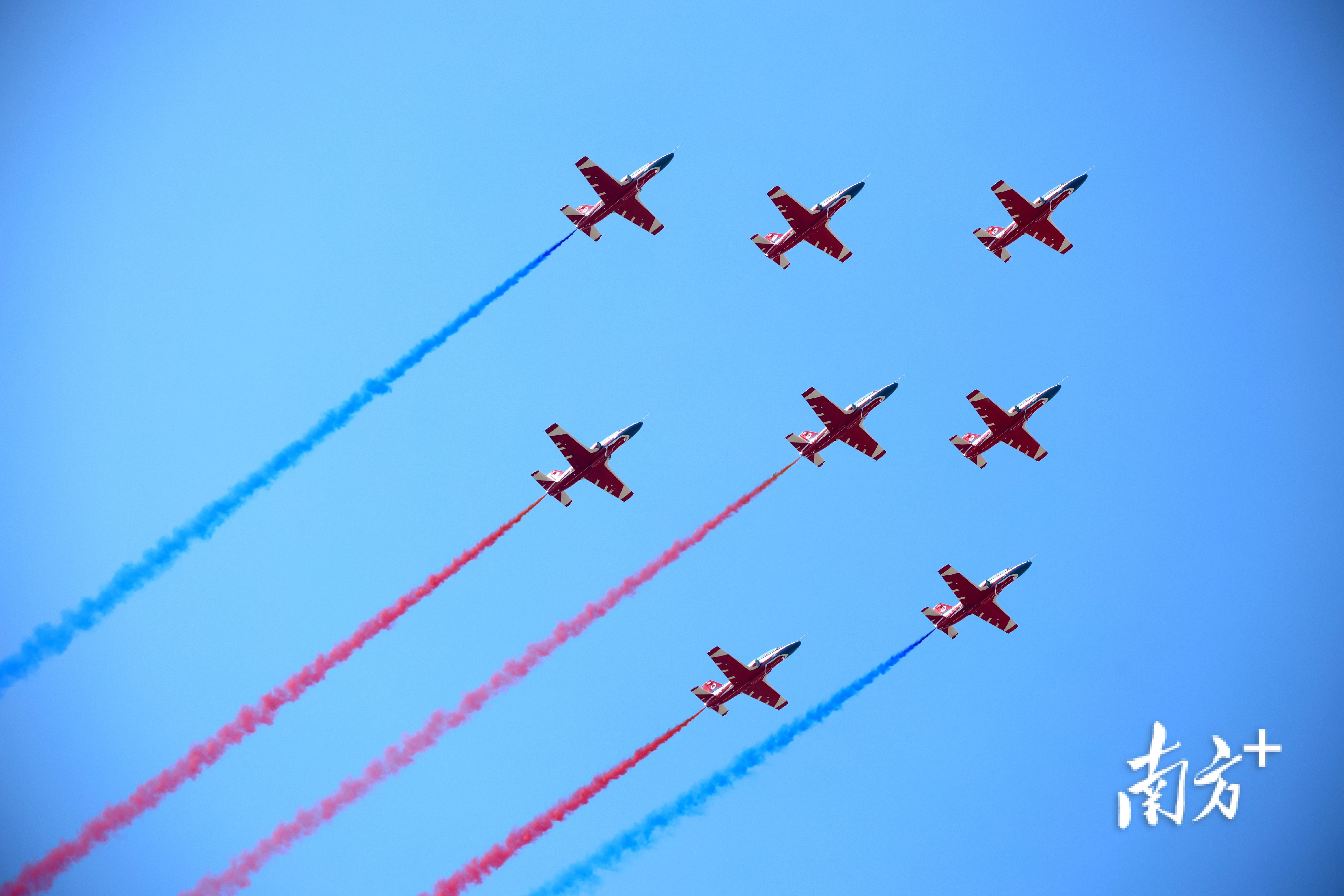 按飞行表演的编排,每一架次表演完后,飞机需要飞到很远的地方重新集结,而这个时候,机群拐弯时可能出现精彩瞬间。