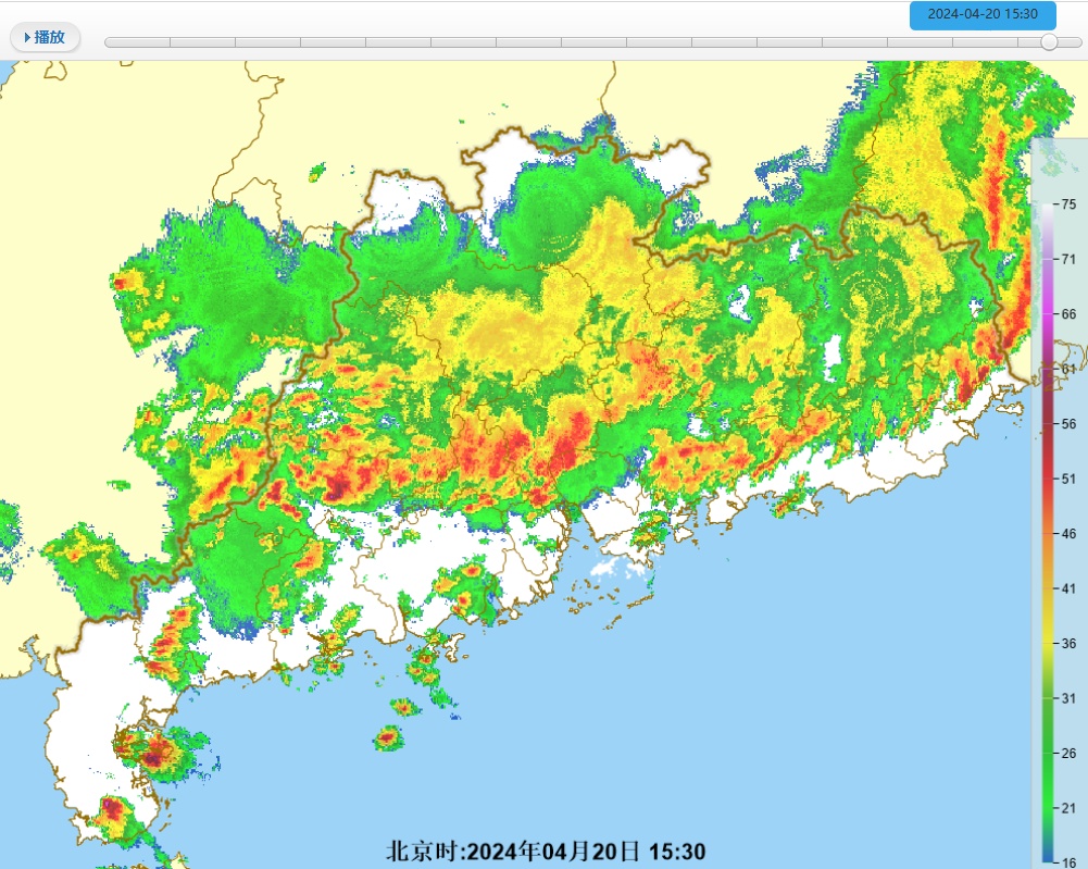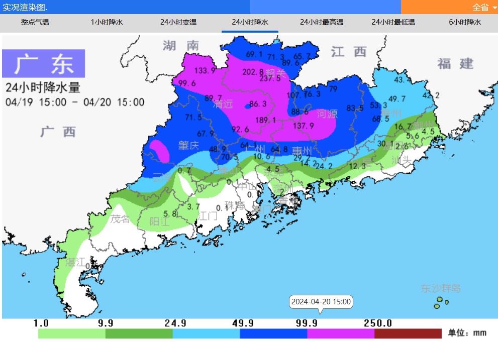 这场雨大致从4月18日开始下,目前广东中北部累积降雨量大。监测显示,在4月19日15时—4月20日20时,粤北北部部分市县累计降雨量达到237.5毫米,达到大暴雨级别,甚至接近特大暴雨级别。