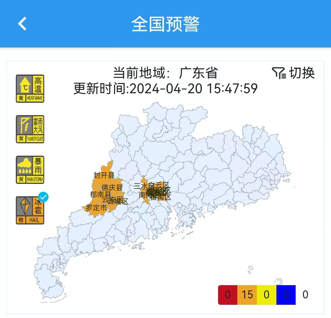 气象部门预计,这轮降雨将持续多日,并且具有持续性和极端性,伴随强对流天气。截至15时47分,肇庆、佛山、广东等市县(区)也发布了15个冰雹橙色预警,另外全省还有超140个雷雨大风预警正在生效中。