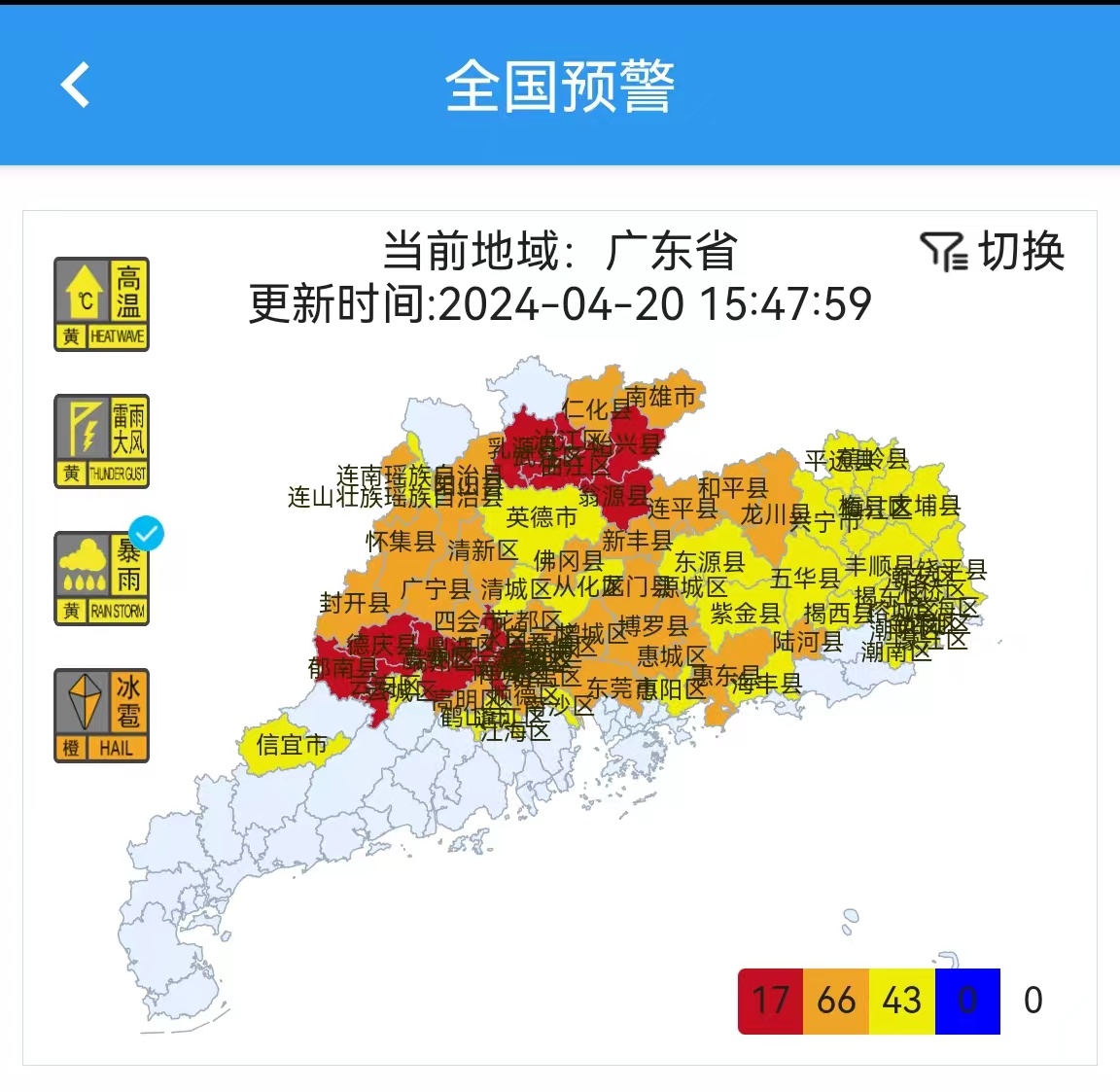 其中,广东中北部降雨尤其大。截至15时47分,肇庆、韶关等多地已启动17个最高级别的暴雨红色预警,另外全省还有66个暴雨橙色预警和43个暴雨黄色预警。