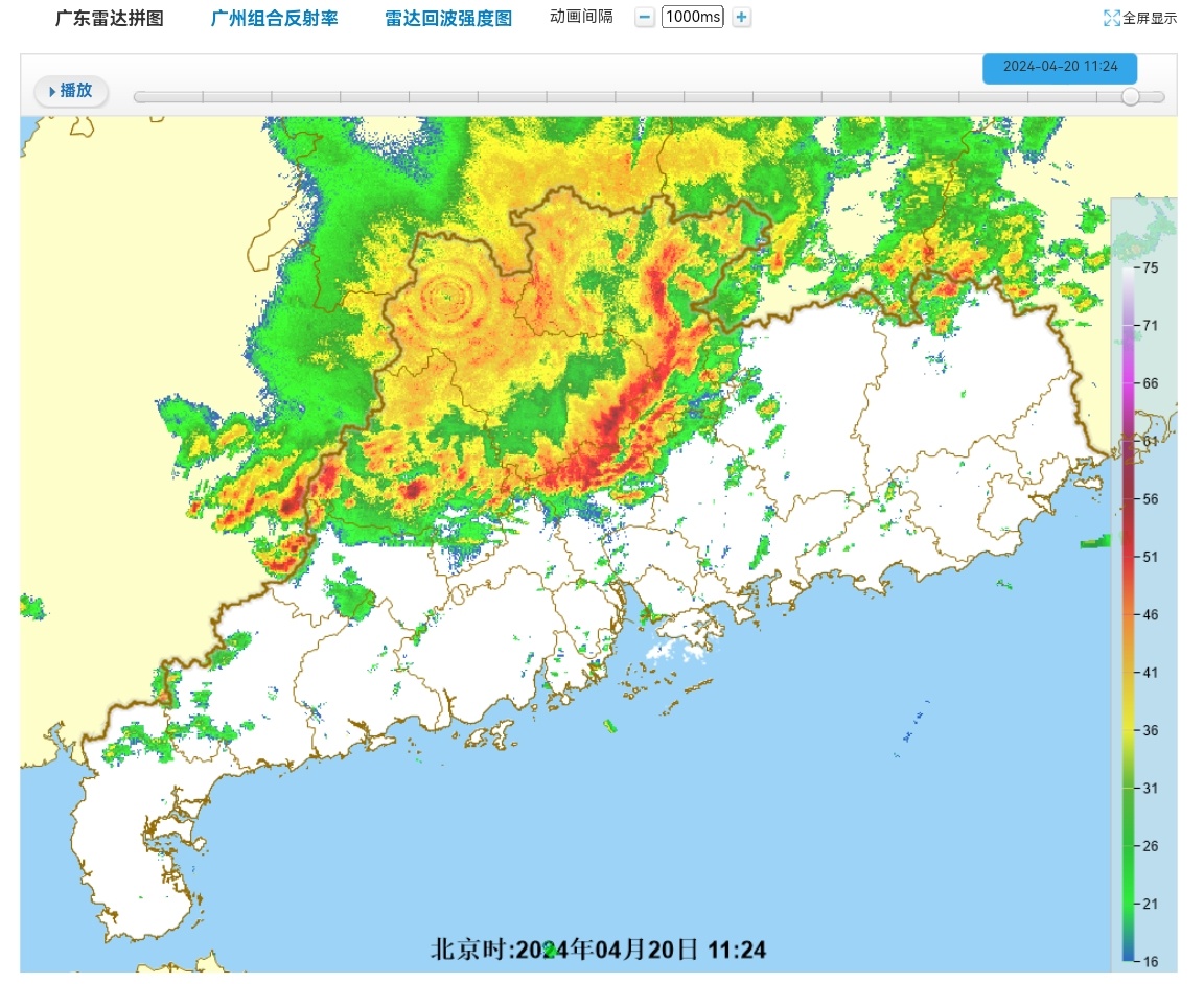 4月20日白天,粤北和珠三角大部分市县出现暴雨到大暴雨,部分市县雷雨时伴随着7级-10级短时大风,其中梅州梅江区长沙镇录得全省最大阵风36.5米每秒(12级)。
