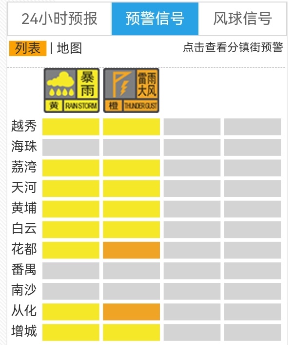 在广州,北部的花都、从化降雨尤其大。截至20日12时,这两个区发布了雷雨大风橙色预警,这些地方的朋友们注意躲避。广州市气象台预计,20日12时至15时,广州将有暴雨,并伴有8级左右大风和强雷电。因此,广州北部的朋友们尤其注意躲避。