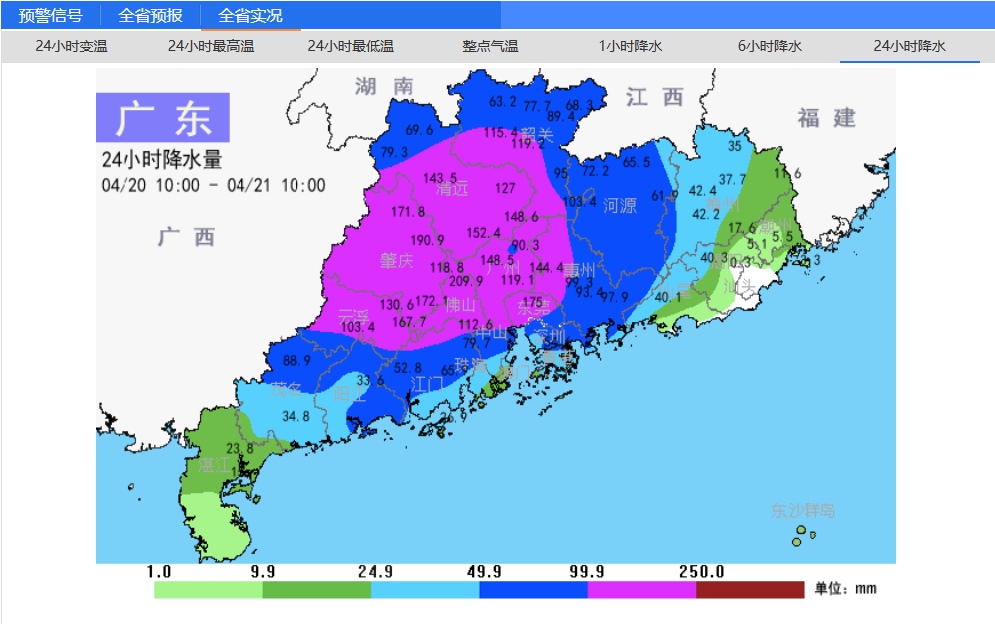 而从24小时降水量来看,20日10时-21日10时,广东中部、北部市县达到暴雨(下图中深蓝色、紫色区域)以上级别。