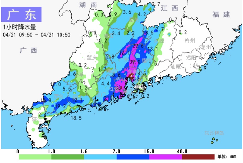 从降雨量上看。一般来说,1小时降雨量在20毫米以上就可以称为短时强降水。气象监测显示,从21日9时50分-10时50分,1小时内,广东中部尤其是珠三角多地出现短时强降水,珠江口沿岸降雨更是有超过40毫米的1小时降雨量。