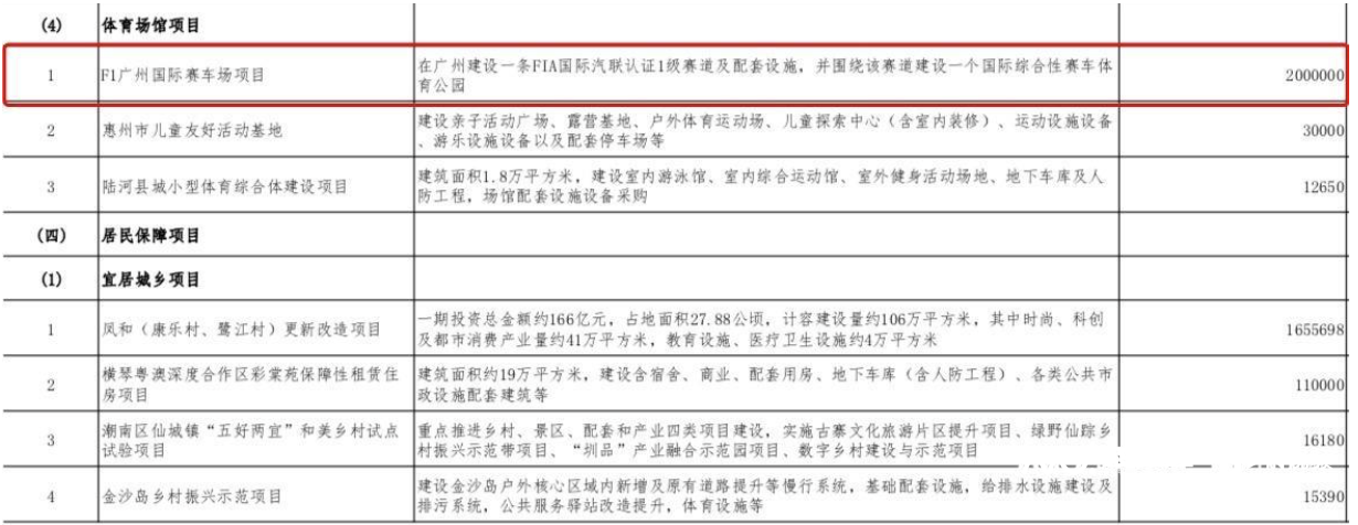 《广东省2024年重点建设项目计划》提到的F1项目。据介绍,广东觅雅国际汽车运动事业发展集团有限公司致力于汽车运动、汽车文化、汽车娱乐、汽车休闲、演艺演出及娱乐体验等领域,意向在花都落地广州国际赛车场项目,打造以国际汽联一级赛道为核心的世界级汽车运动中心,涵盖汽车赛事、汽车文化体验、汽车科技研发、汽车休闲娱乐等多功能板块。