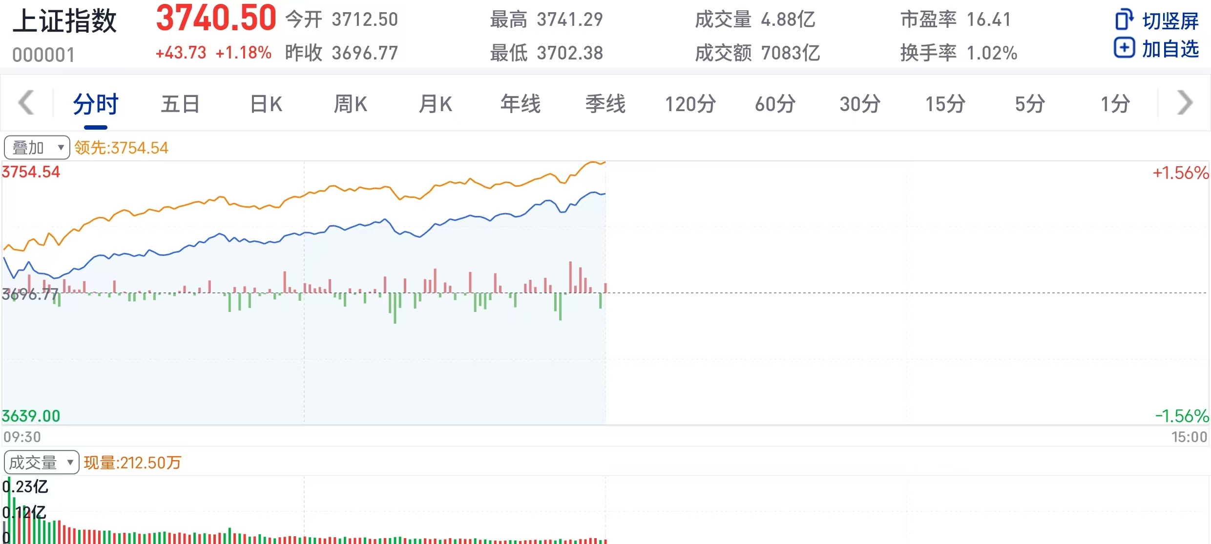8月18日,A股继续大涨,上午11时08分,上证指数摸高至3731.76点,突破2020年“结构性”牛市高点3731.69点,成为2015年8月19日以来的新高点。午间收盘,沪指涨1.18%,深成指涨2.25%,创业板涨3.63%。今日成交额为1.75万亿元,较上个交易日放量4197亿元。A股4497家股票上涨,816家股票下跌。