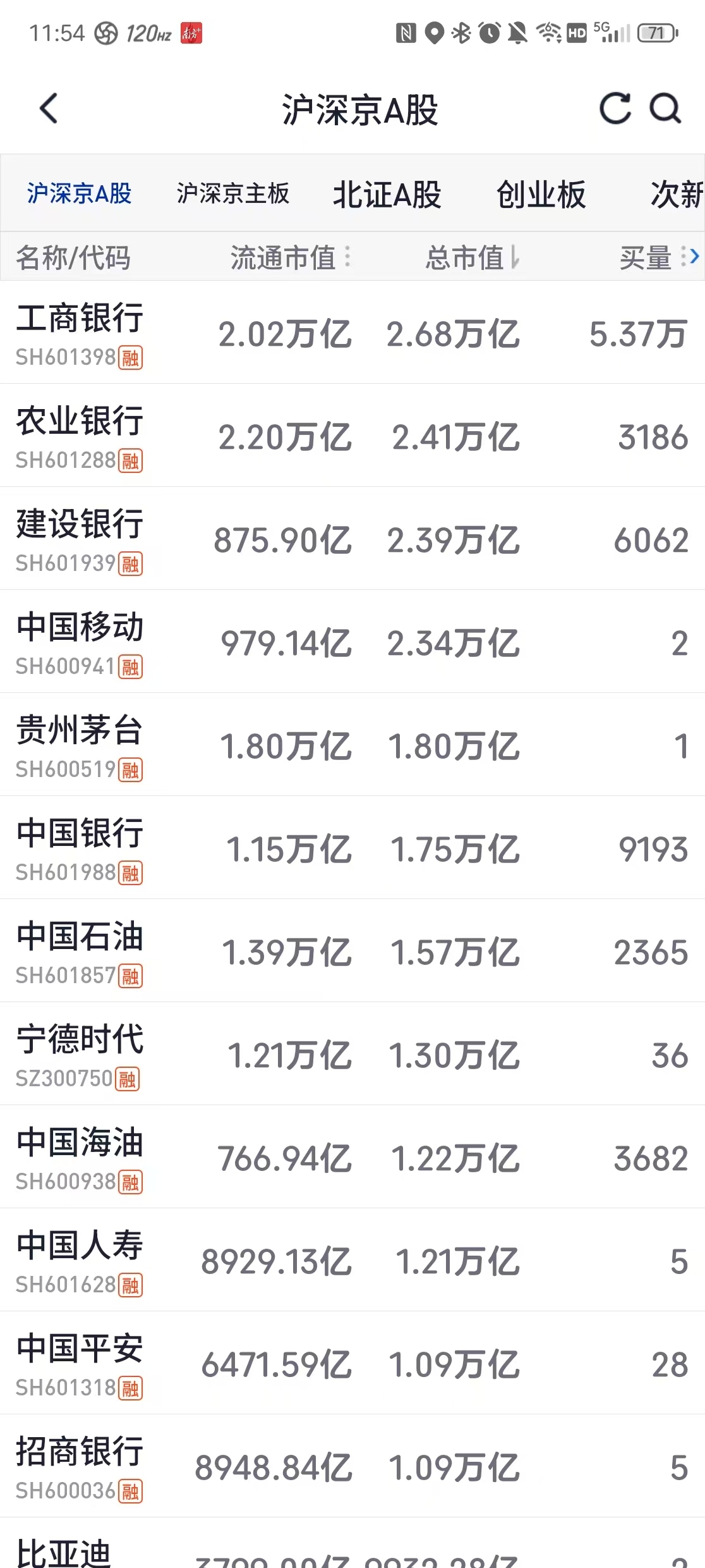 同时,A股公司A股市值总和首次突破100万亿元(以A股最新价*A股总股本计算),创历史新高。工商银行、农业银行、建设银行和中国移动市值达2万亿以上,此外,贵州茅台、中国石油、中国银行、宁德时代等4股A股市值均超万亿元。