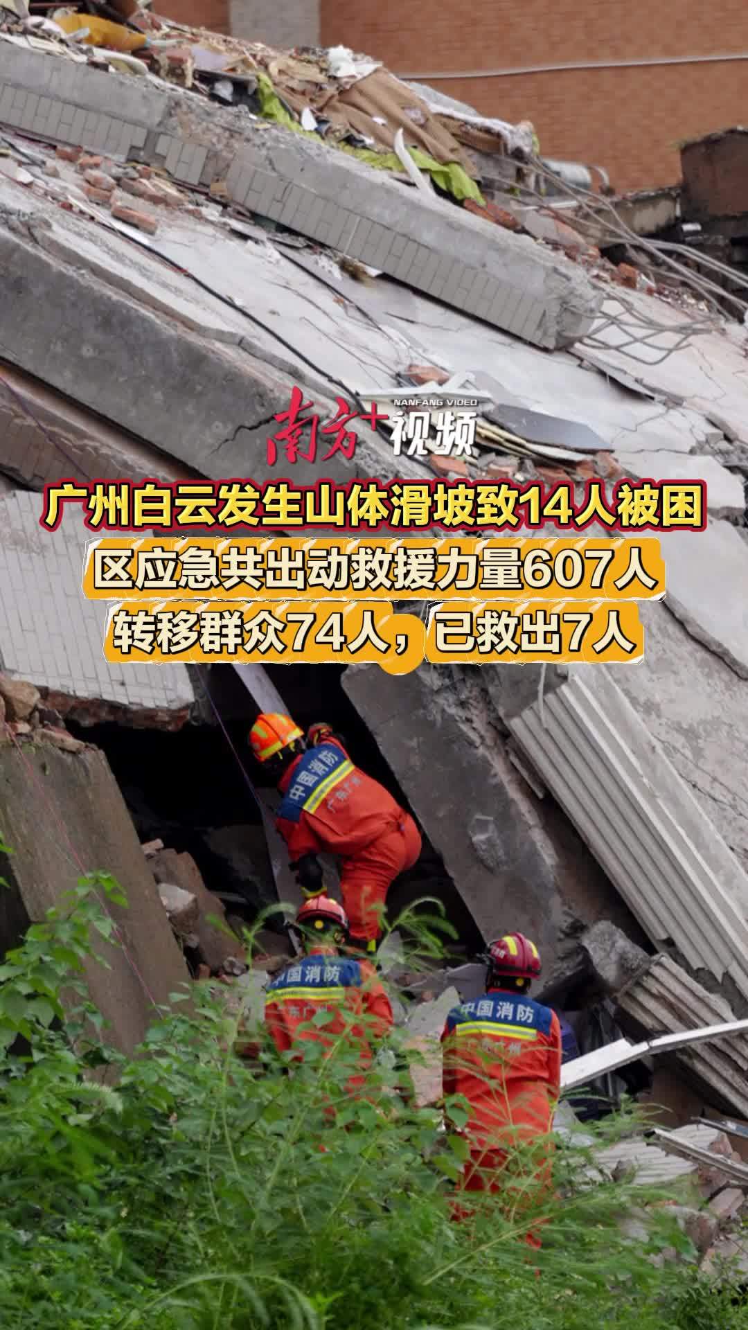 广州白云发生山体滑坡致14人被困 区应急共出动救援力量607人转移群众74人,已救出7人