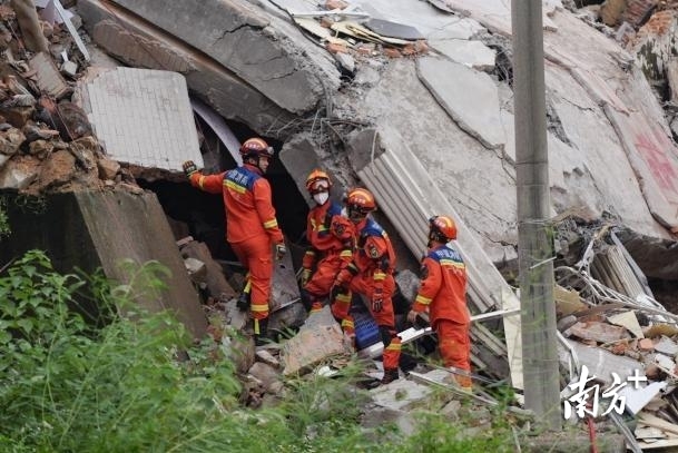 8月6日中午,南方+记者现场看到,有应急消防救援队伍正在开展救援,救援工作人员在指挥应急救援工作,目前仍陆续有消防应急车辆进入事发现场进行救援。