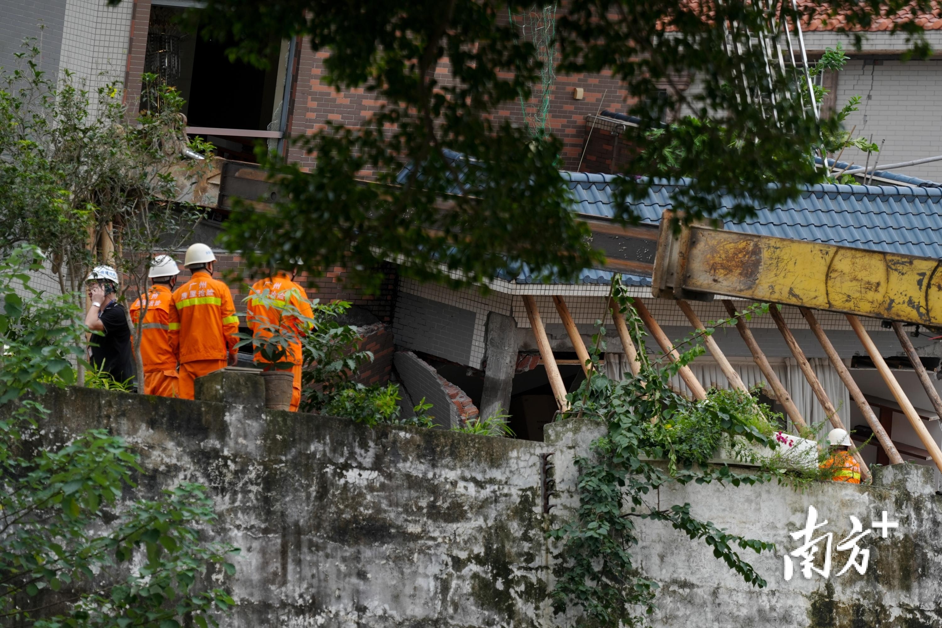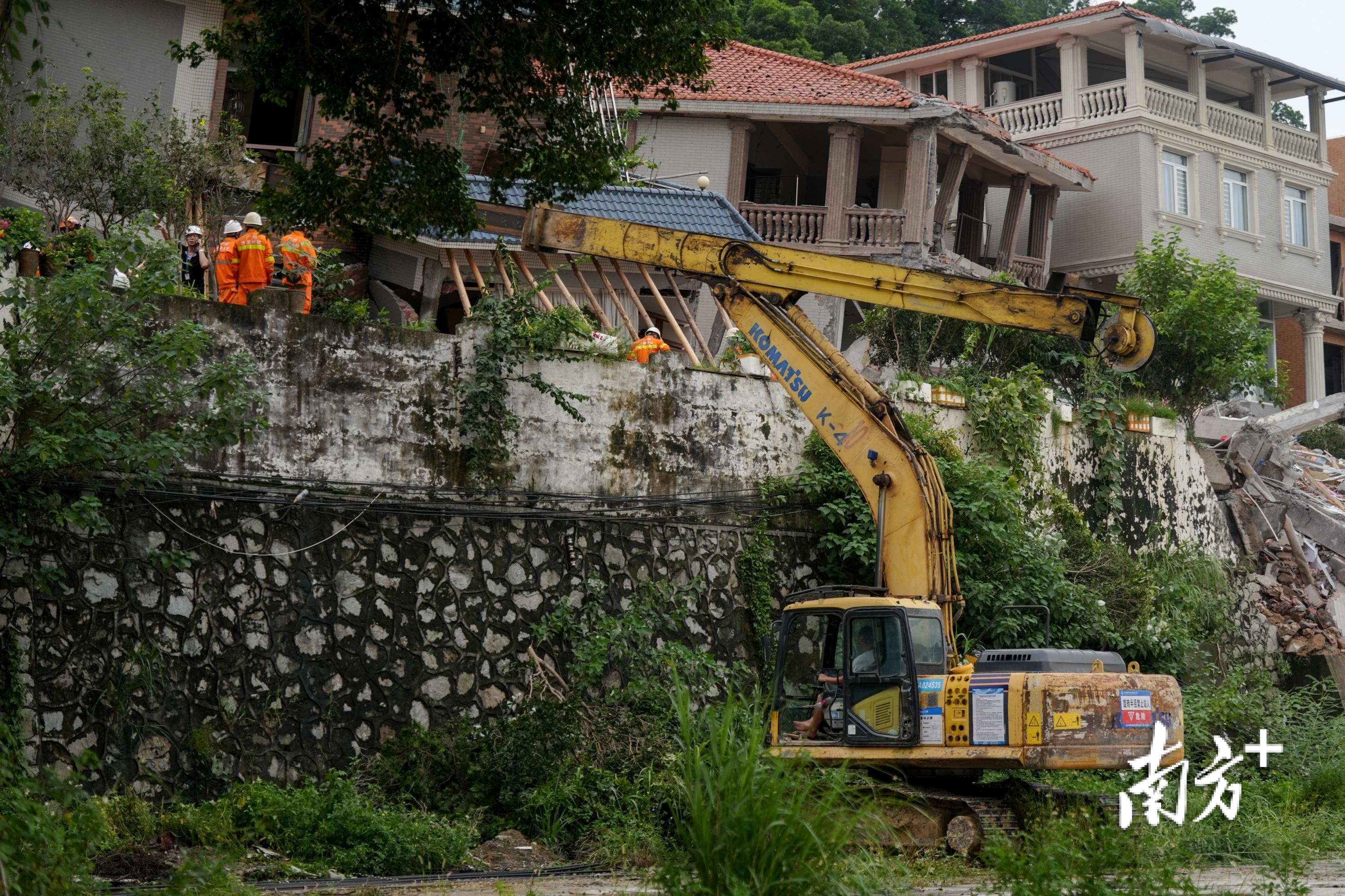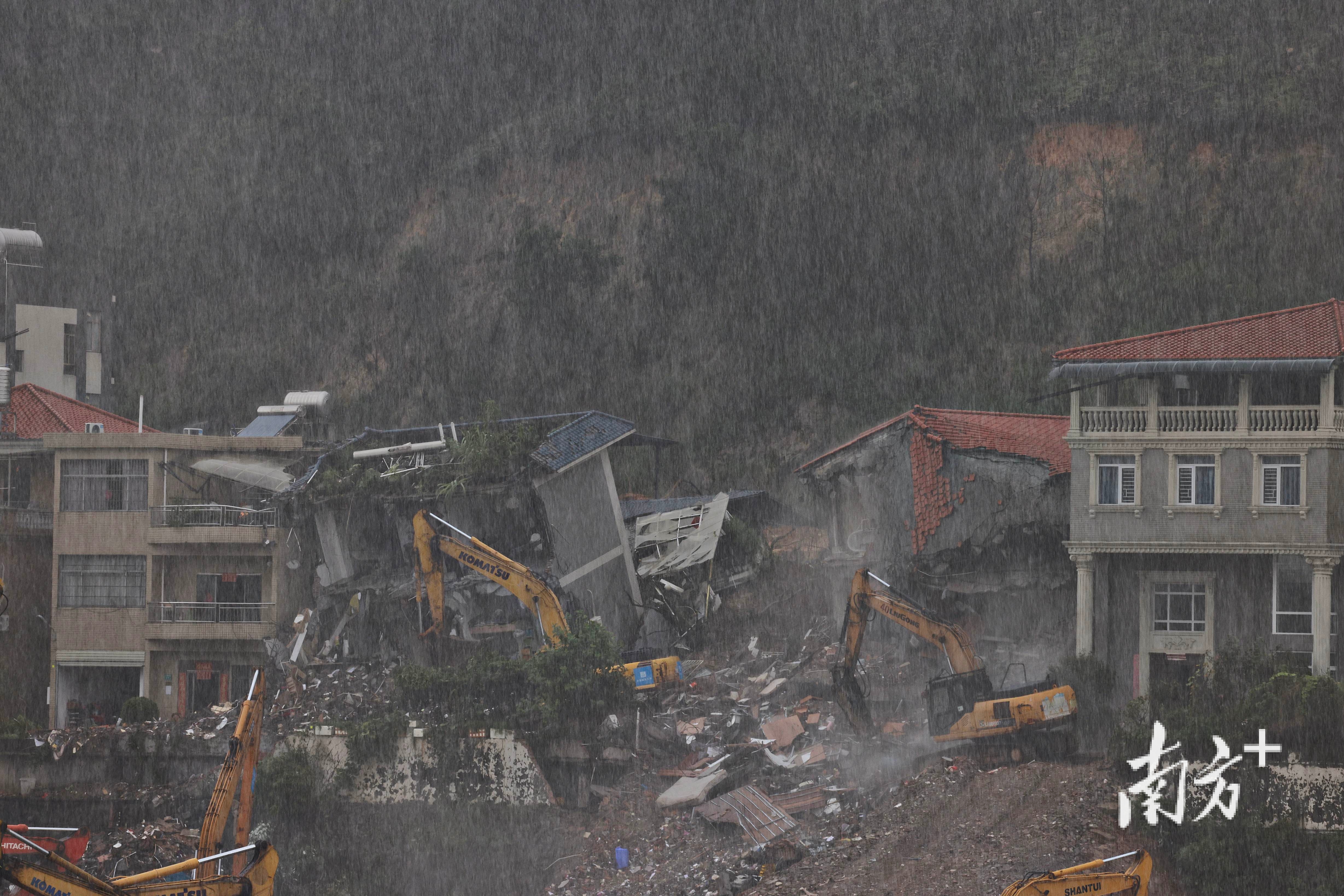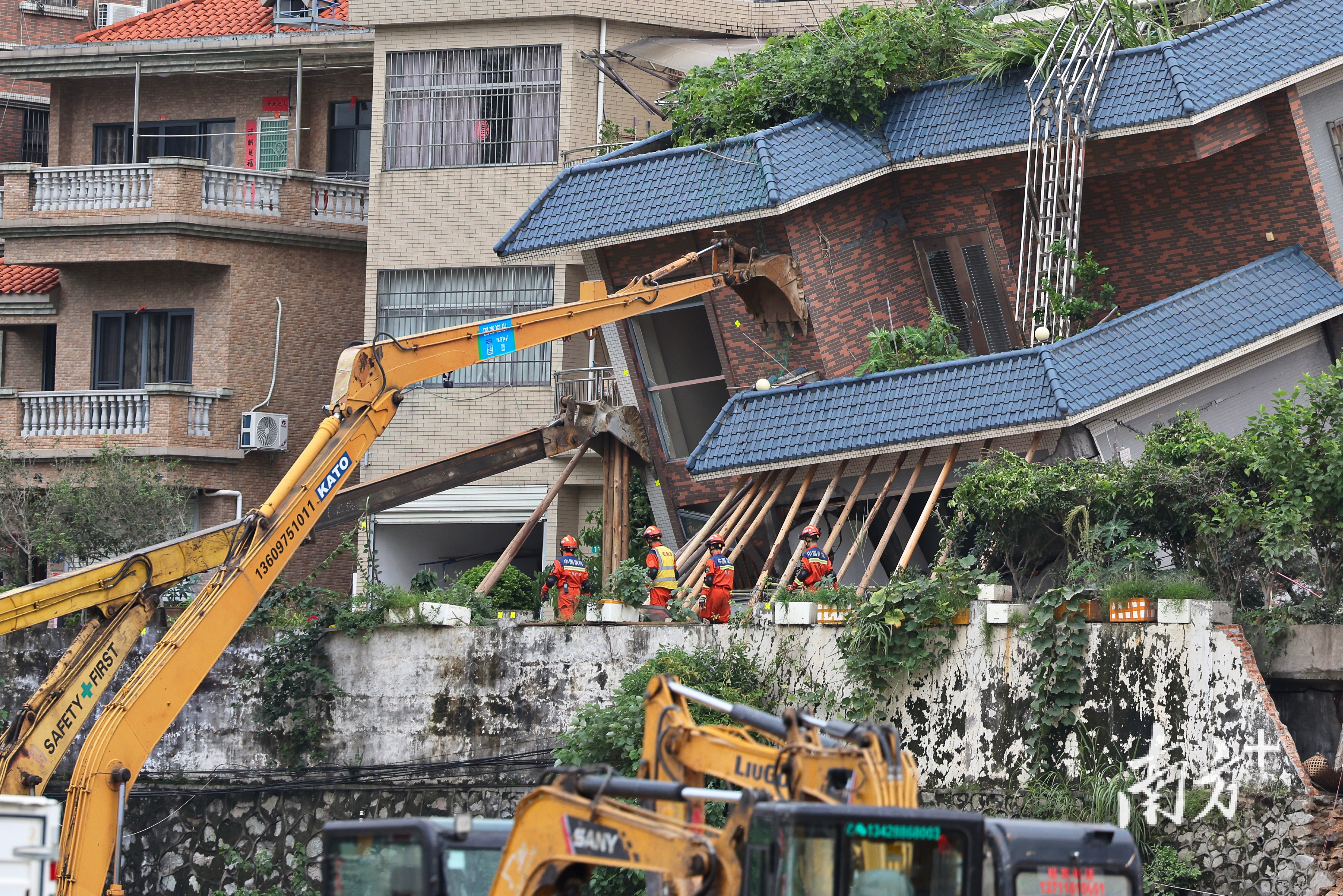 8月6日下午4时左右,南方+记者在救援现场看到,救援工作人员正在用挖掘机顶住倾倒的房屋,随后用木头支撑住房屋。