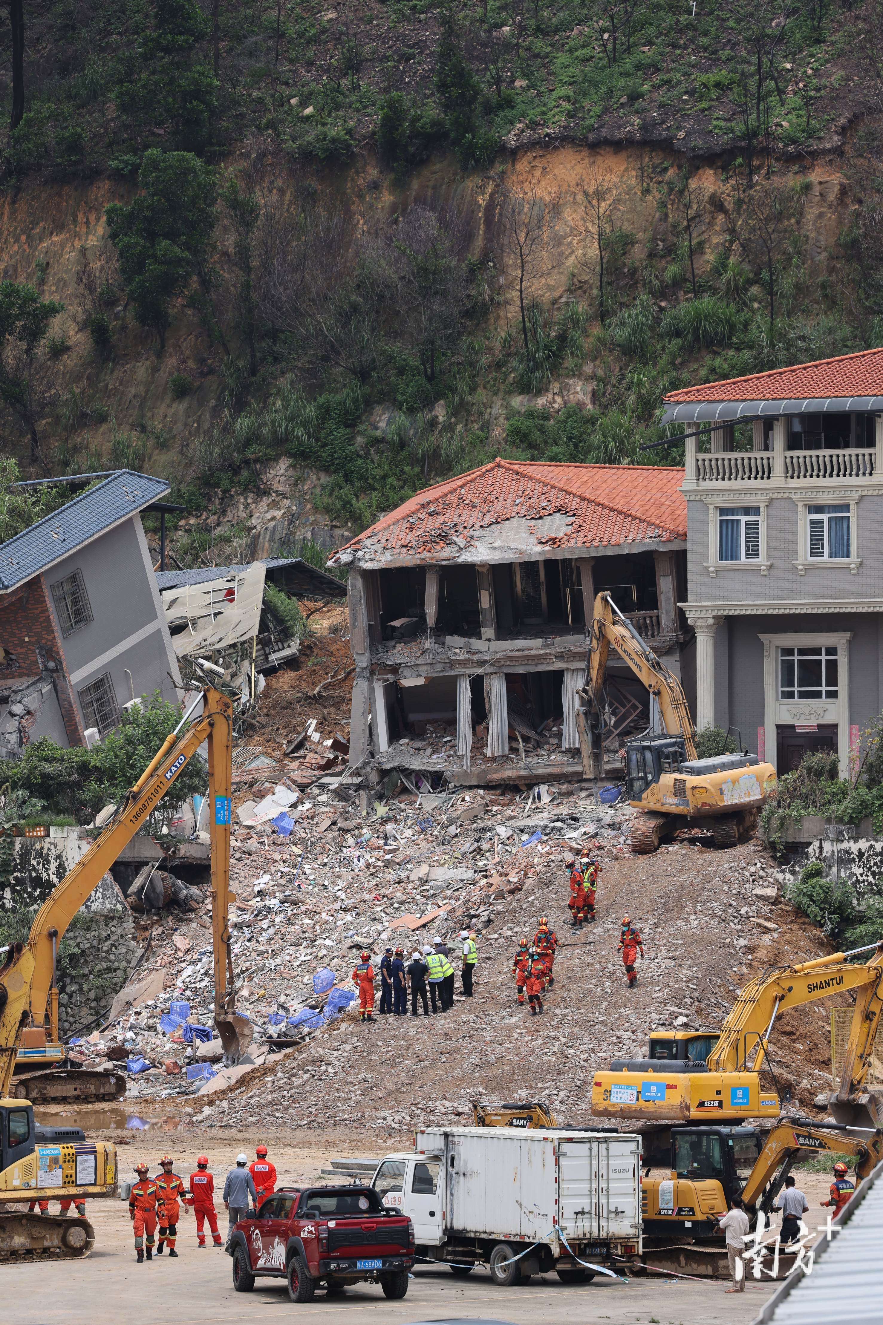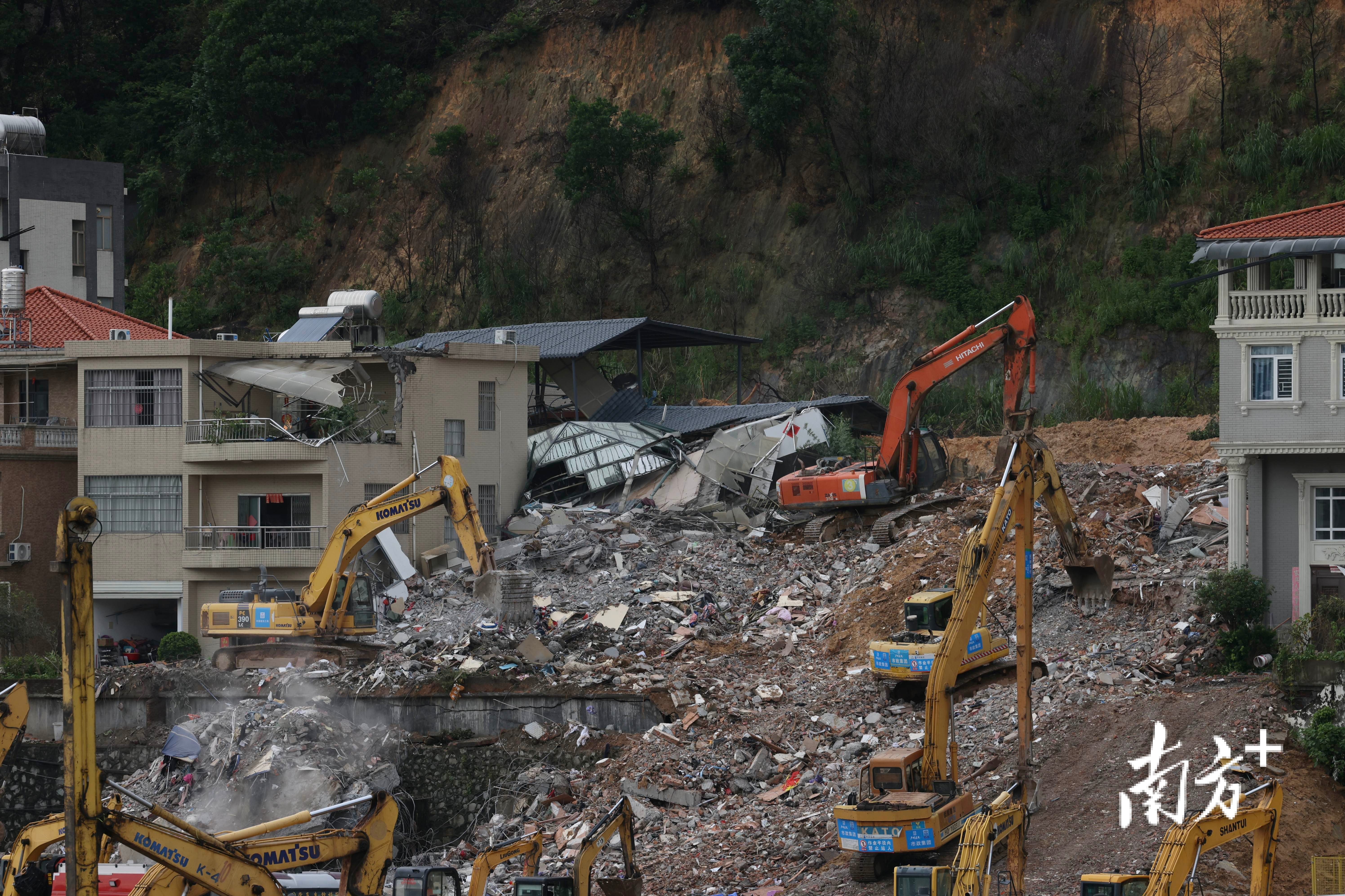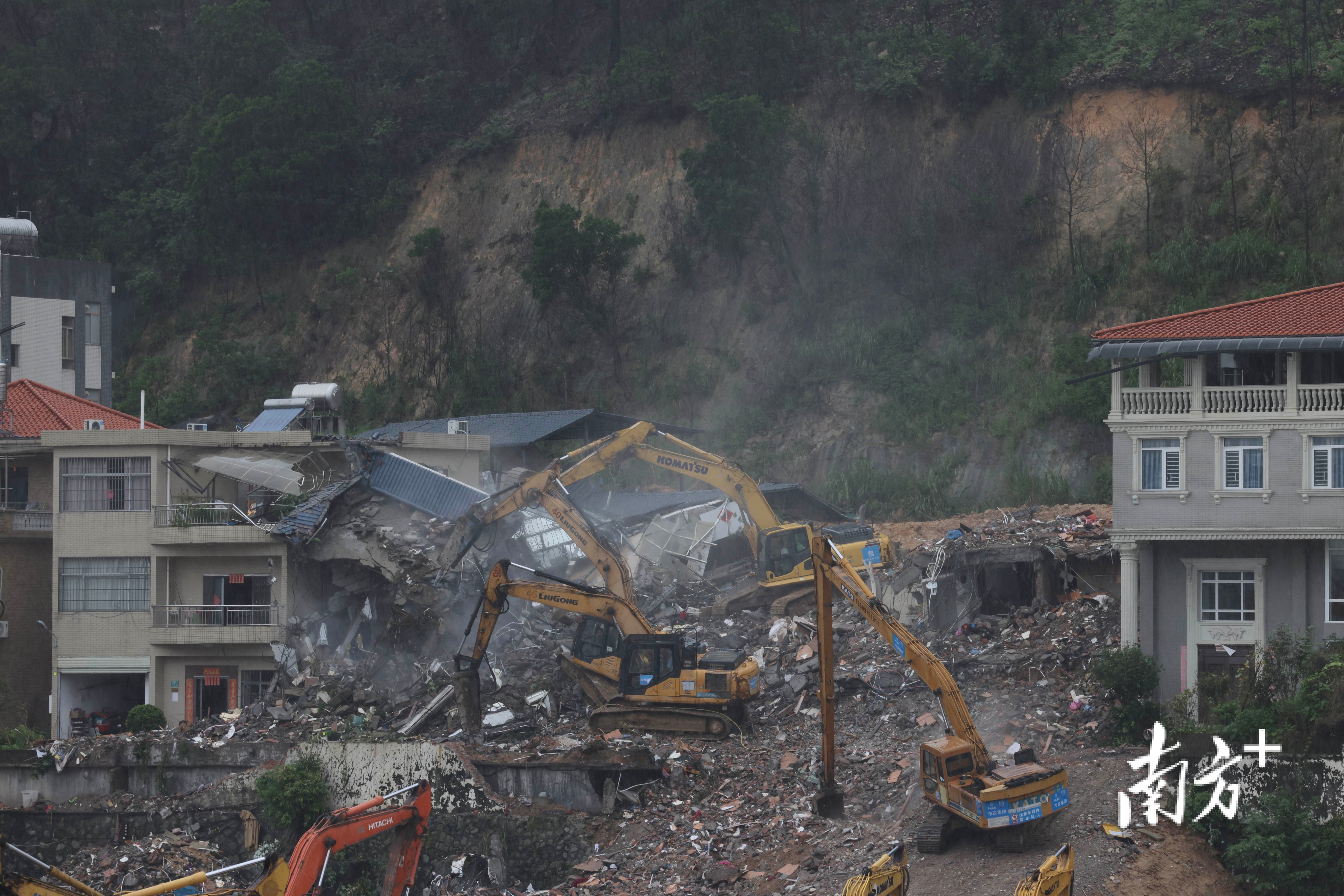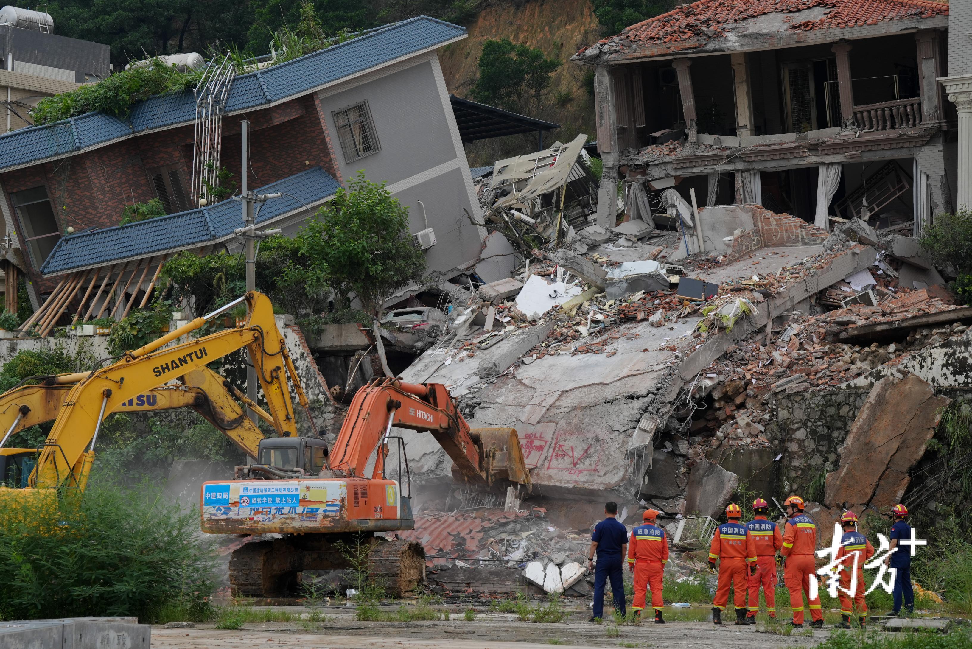 8月7日下午5时许,广州山体垮塌现场被破除房屋的清理工作正在进行。南方+记者在现场看到,此前倾斜的两栋楼房已经不复存在。据悉,破除工作完成后,救援人员将开展深度搜救工作。