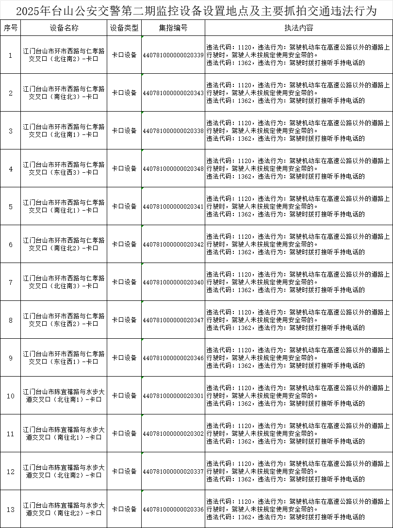 为规范道路交通秩序,营造安全、有序、畅通的道路交通环境,有效预防和减少道路交通事故,保障广大人民群众生命和财产安全;根据《中华人民共和国道路交通安全法》《道路交通安全法实施条例》《行政处罚法》等相关法律法规规定,台山市将启用闯红灯交通监控设备共13套。现将设备的设置地点、主要抓拍交通违法行为等进行通告(详见附图),上述设备于2025年10月26日起开始启用。