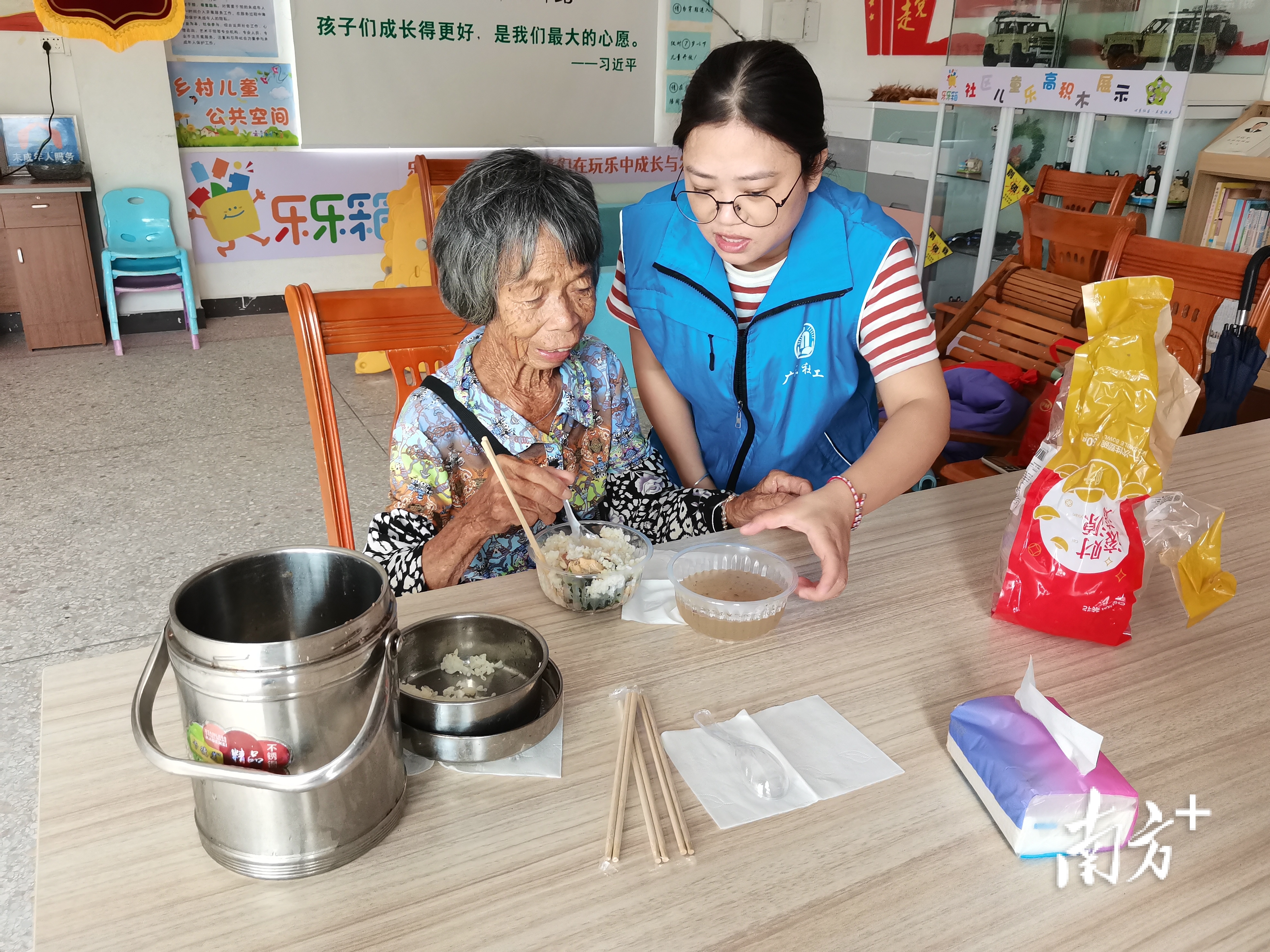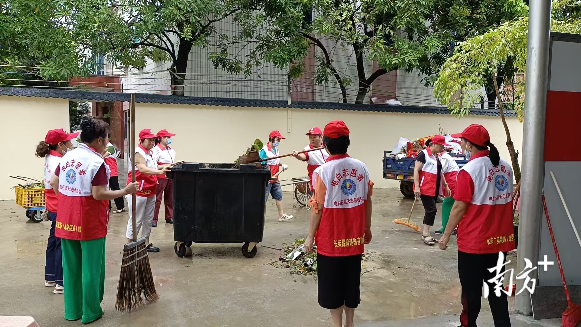 电白区蓝天志愿者在长者饭堂开展垃圾清理工作。