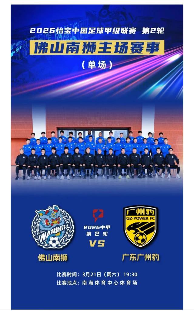 3月21日,2026中国足球甲级联赛第2轮赛事中,佛山南狮将迎战劲旅广东广州豹,门票已于3月17日12:00正式开售。详情>>