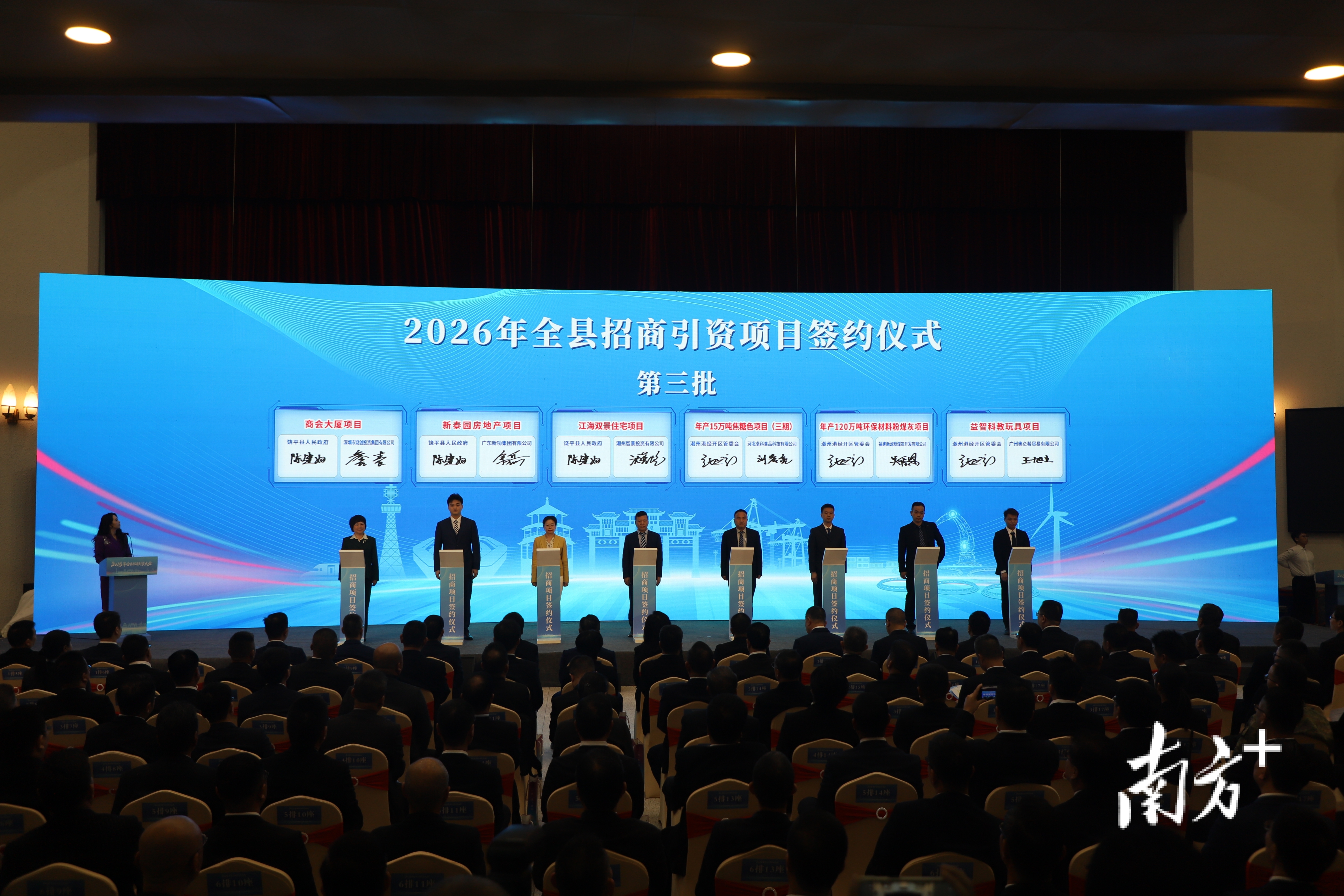 3月14日上午,饶平县举办2026年全县招商引资大会,总投资约53.65亿元的19个项目完成签约。“我将带头冲在招商一线”“企业有任何需要,随时都可以找我”“我们一定当好‘服务员’‘后勤部长’”……会上,饶平县委书记蔡益雄、县长杨镇荣的表态,体现了饶平一如既往的真诚。“真”与“诚”的坚实力量,政与企的双向奔赴,在这场大会中展现无遗。