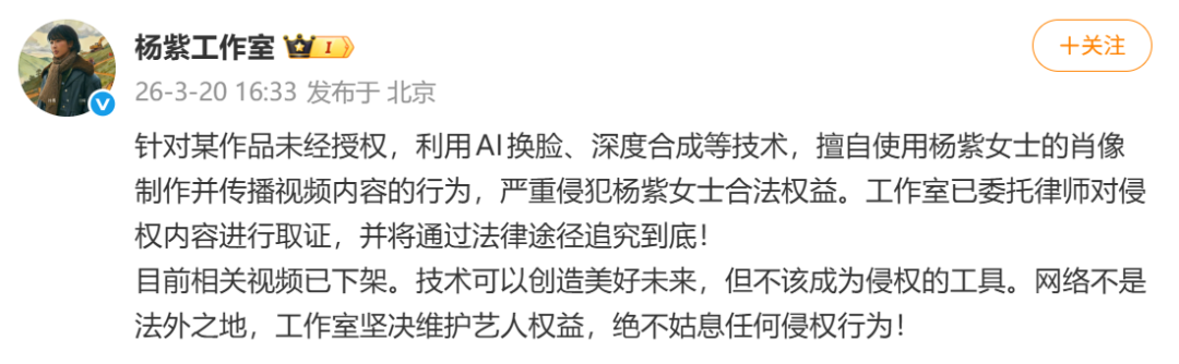 3月20日,杨紫工作室发文:针对某作品未经授权,利用AI换脸、深度合成等技术,擅自使用杨紫女士的肖像制作并传播视频内容的行为,严重侵犯杨紫女士合法权益。工作室已委托律师对侵权内容进行取证,并将通过法律途径追究到底。
