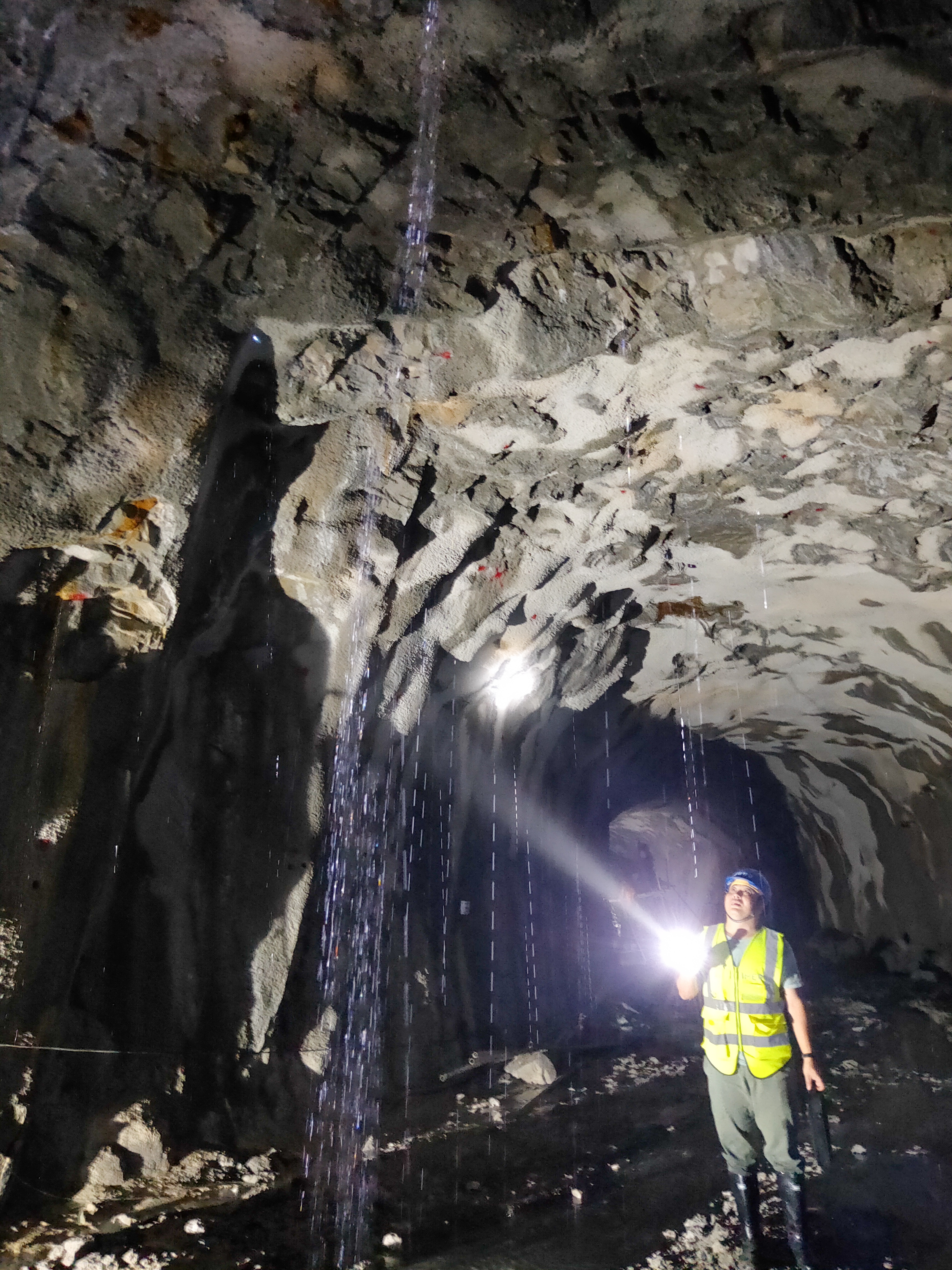 步梯进度过半,上行方向的左手边出现一处泵房。排水是江门中微子实验的一个难题,源源不断涌出的地下水要从700米深处逐级往上抽,这里是一处中继。