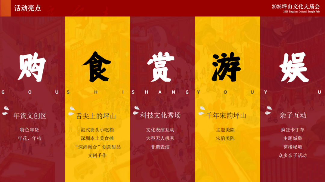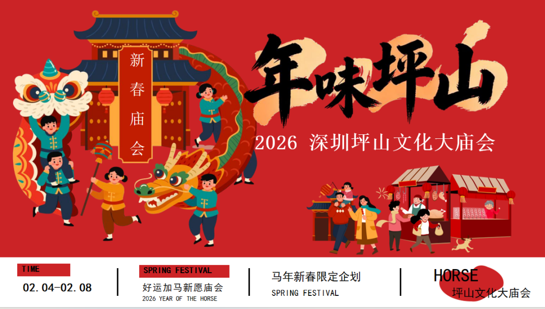 一大波精彩活动接力登场,舞狮纳福、坪山麒麟舞喜庆上演,鱼灯祈福巡游点亮浓浓年味。作为“粤美村晚迎新春”活动的一部分,更有全民期待的“坪山市民大春晚”压轴登场。庙趣游园带你沉浸式体验奇幻新年,年货大集汇集潮趣好物,一站式承包你的逛、吃、玩全维需求。现场还设有多重福利派送,精美礼品抽奖送不停,新春惊喜,就等你来。