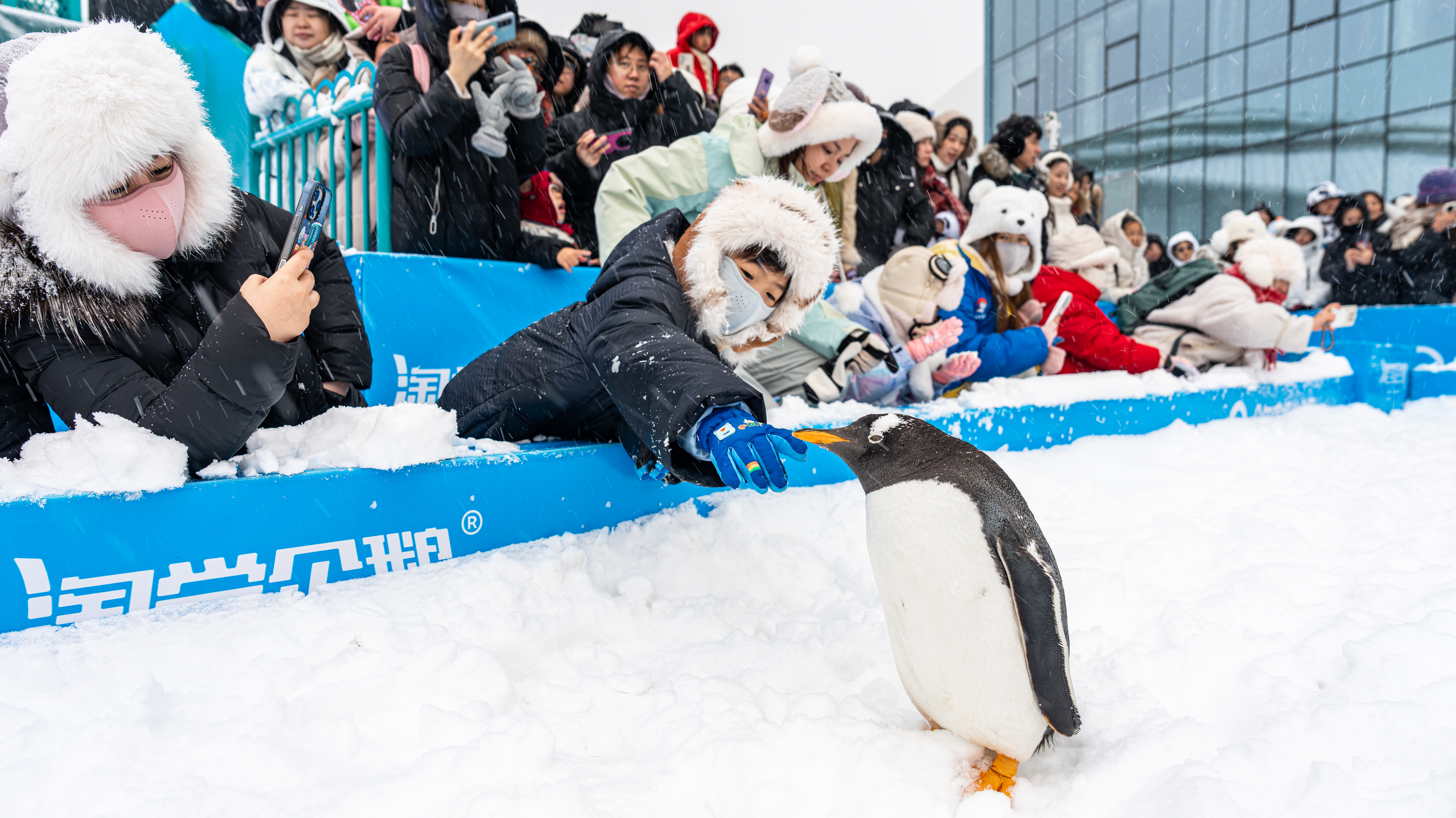 全国各地的研学团队来到哈尔滨极地公园,与“淘学企鹅”近距离互动(图片由哈尔滨极地公园提供)