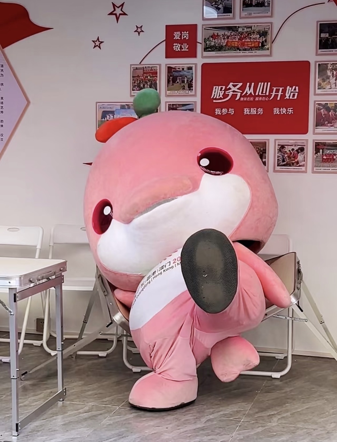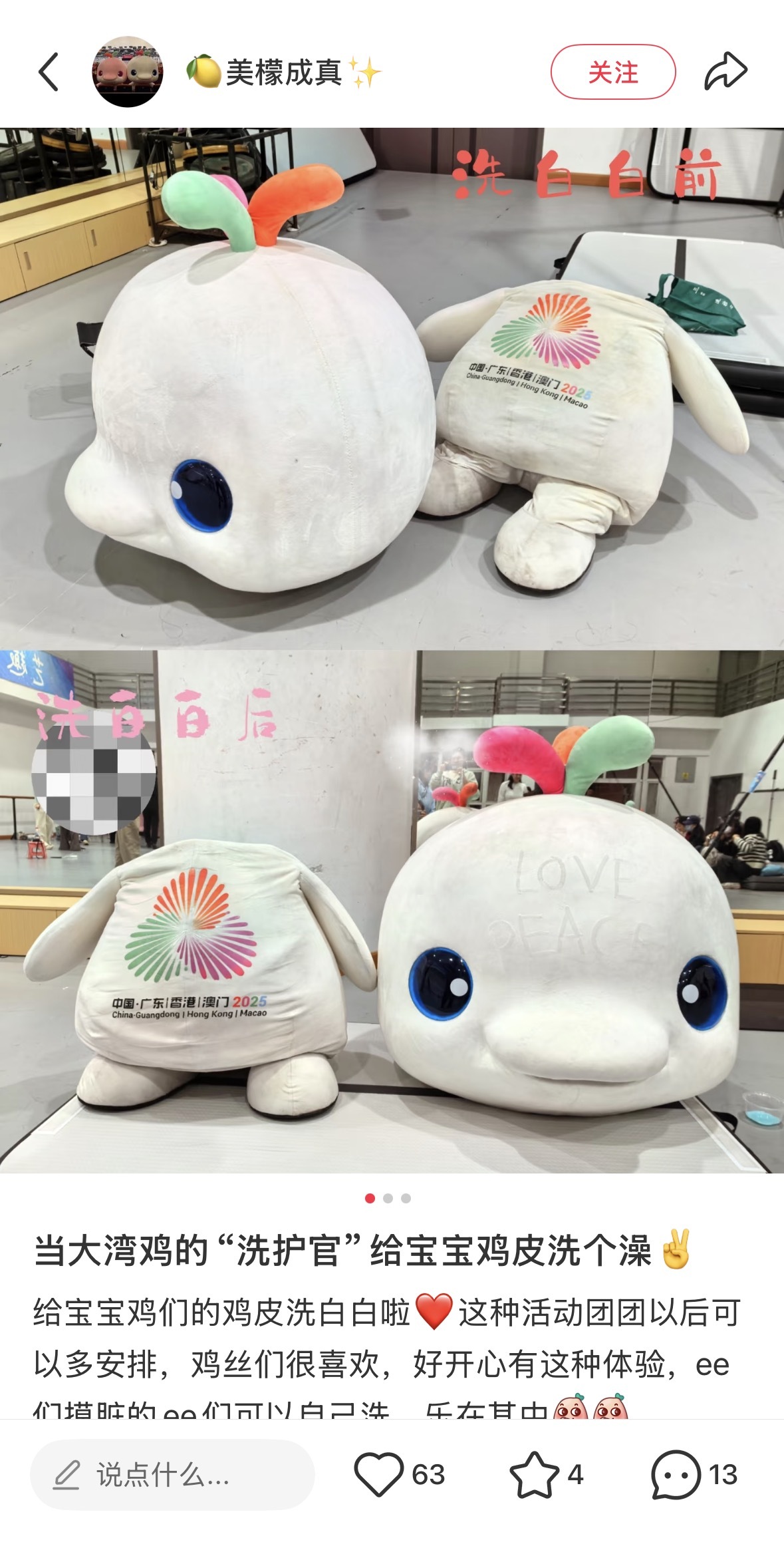天天出去疯玩,“大湾鸡”难免变成“脏脏鸡”。最近一期见面会,广州杂技团邀请粉丝清洗“大湾鸡”的人偶外壳,亲手“洗鸡皮”。