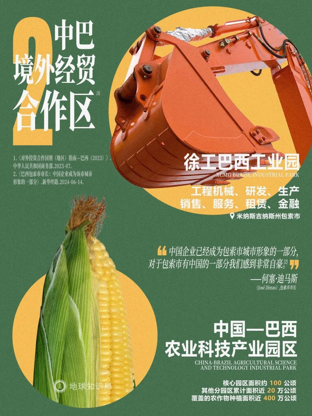 徐工集团在米纳斯吉纳斯州包索市建立了“徐工工业园”;隆平农业发展有限公司和巴西隆平高科农业发展有限公司共同发起筹建“中国—巴西农业科技产业园区”。