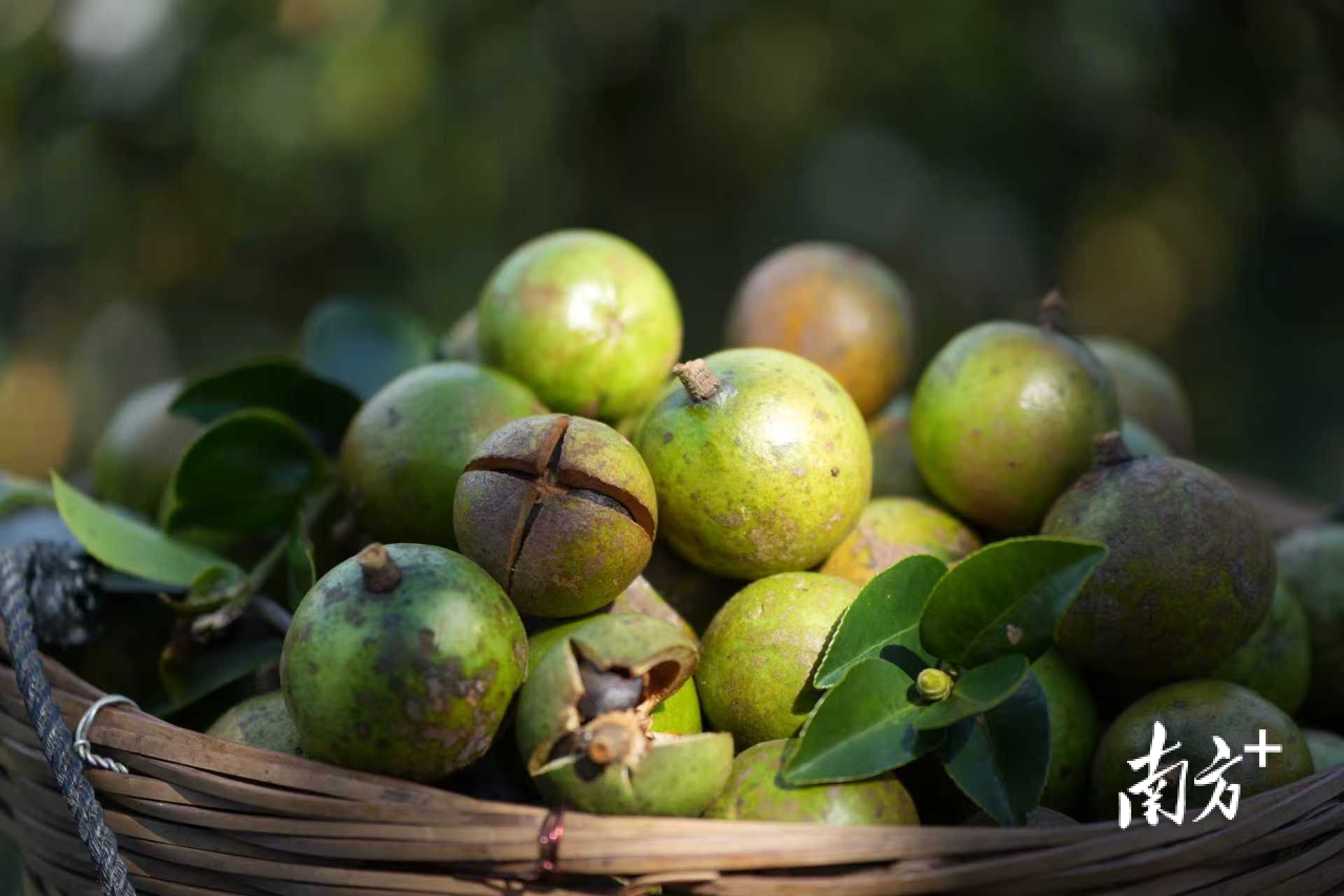 郁南油茶果实呈球形或扁圆形,果皮厚实,内含饱满茶籽。