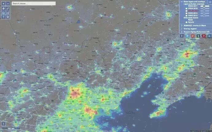 到底哪里才能避开光害呢?你可以参考光害地图。比如下面北京周边光害图所示,图上越暗的地方,光害就越小,观星和看流星雨的效果也越好。此外,记得要找一片开阔地,周围不要有太多遮挡。根据经验,多数流星会出现在靠近地平线的低空附近。