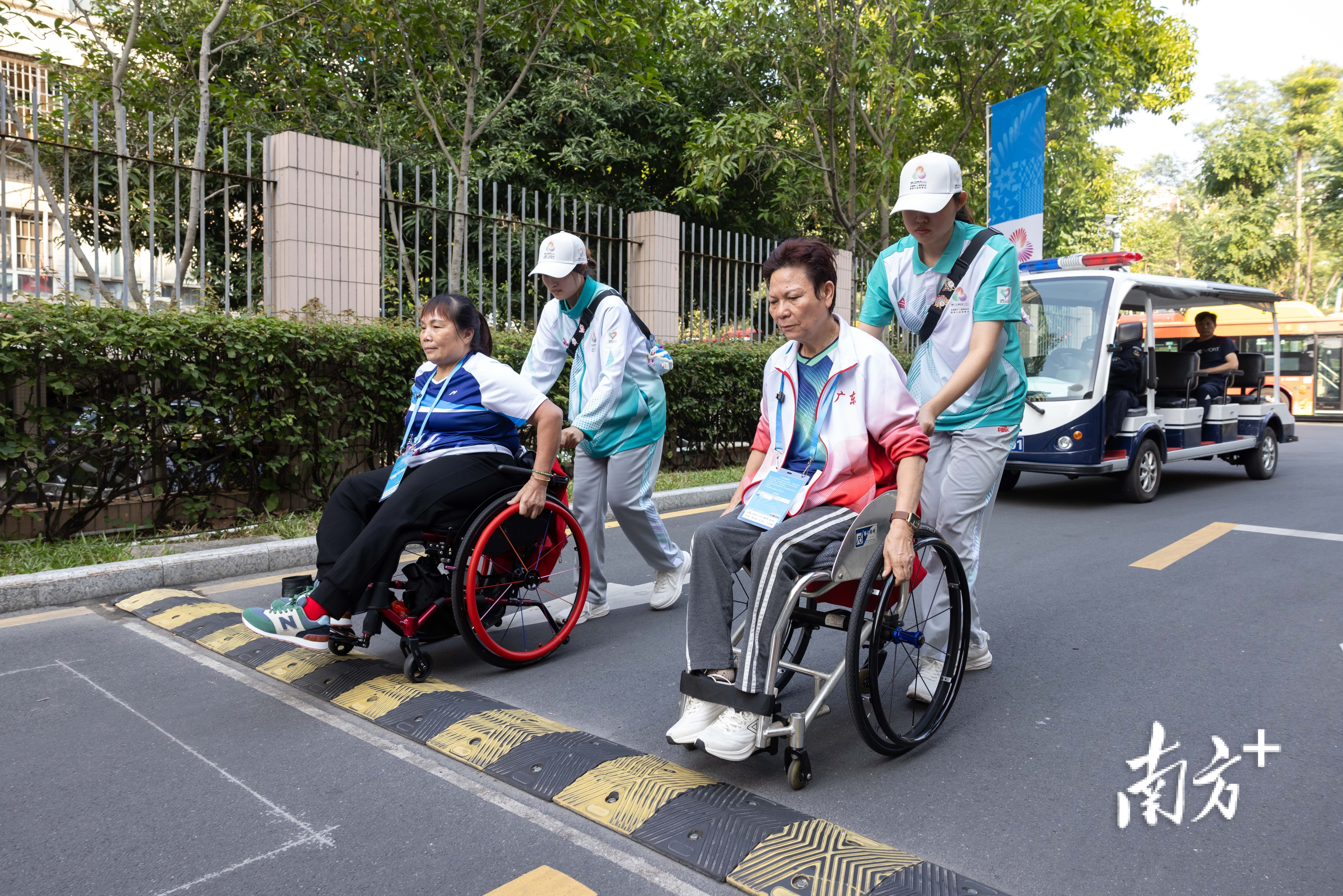 黄丽明(右)与自己的双打搭档吴桂妹在志愿者的协助下前往训练馆练球。