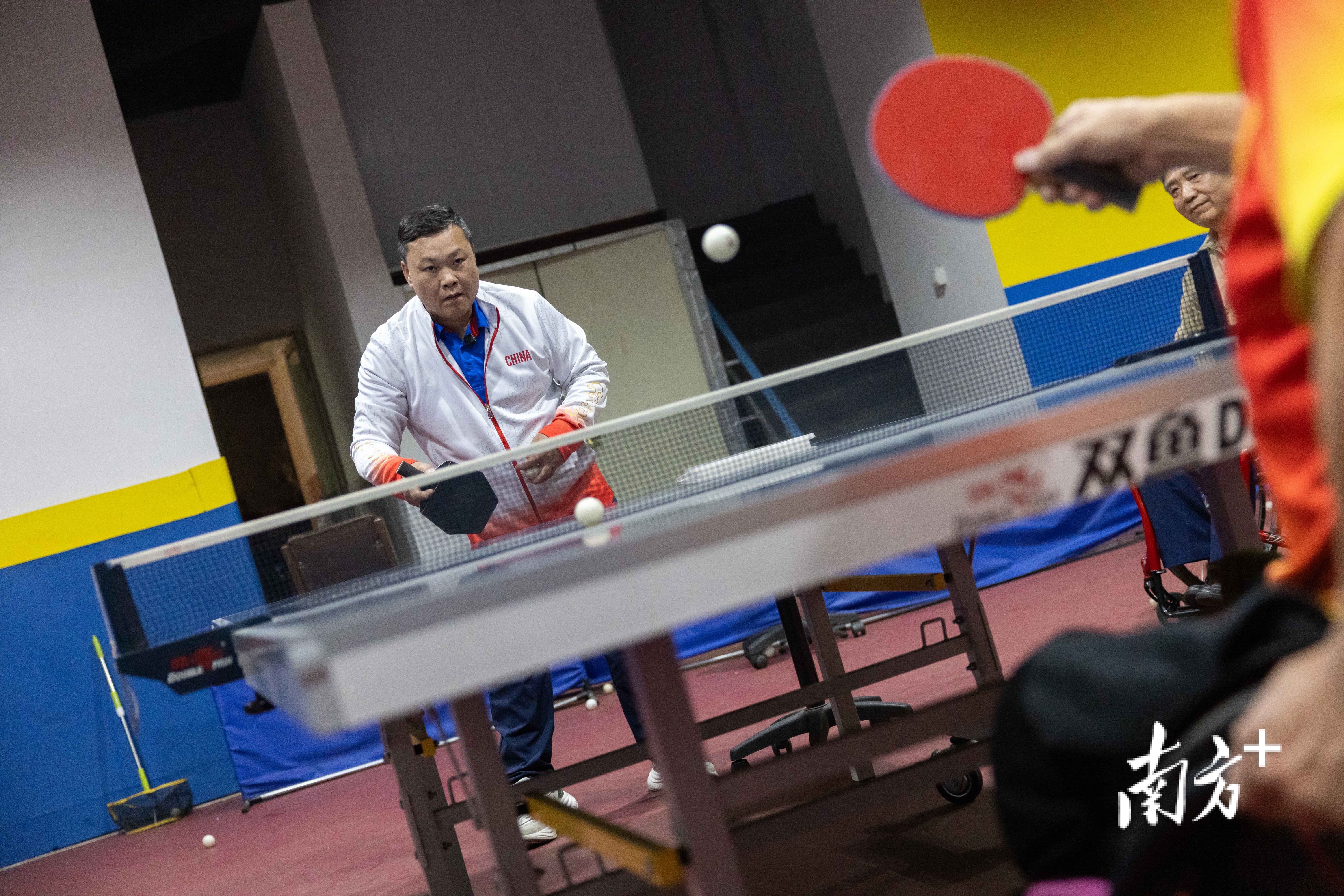 黄丽明平常在吴汉斌指导下练习乒乓球。