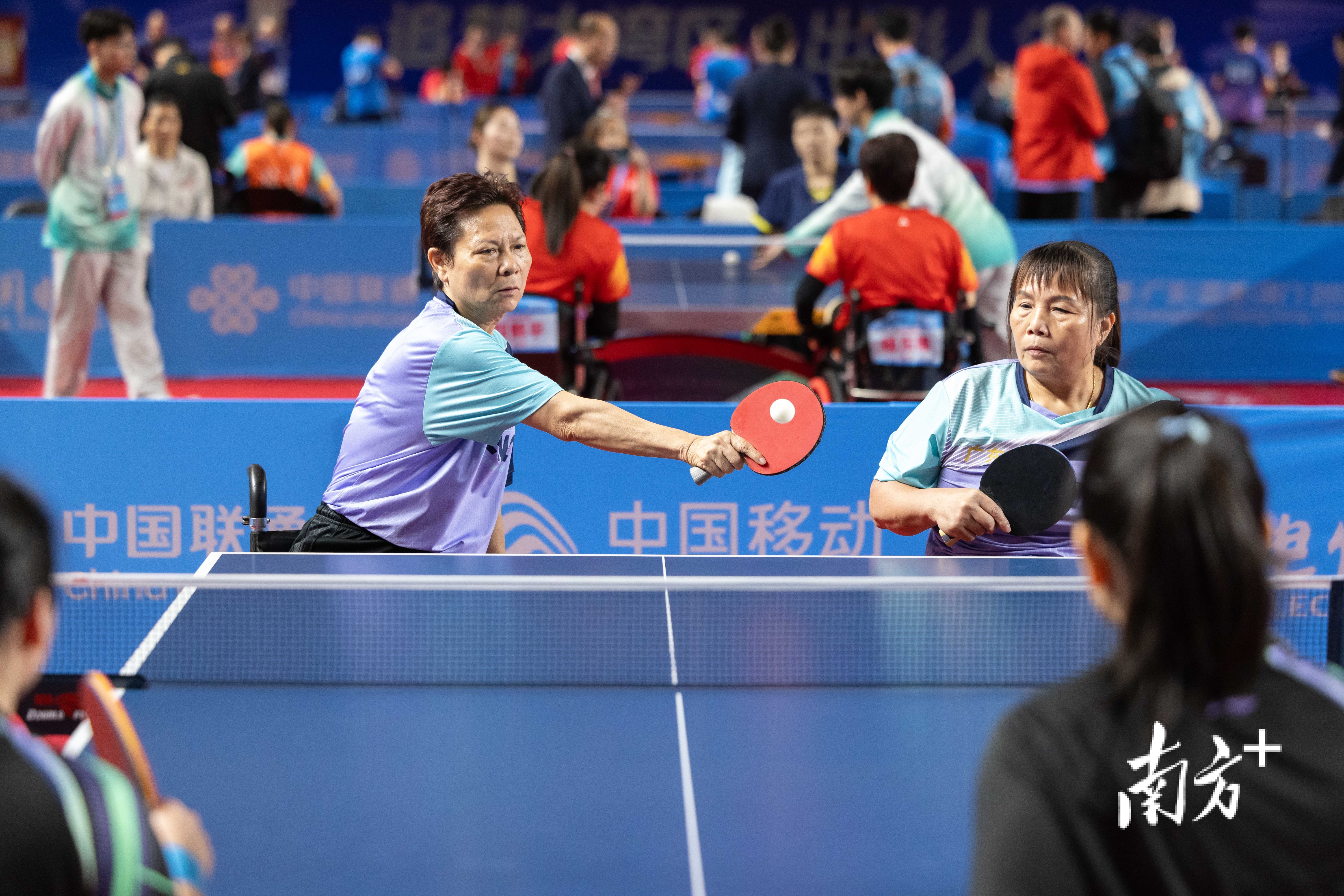 12月8日,在兵乓球TT5女子双打小组赛中,黄丽明(右)撑起身子击球。