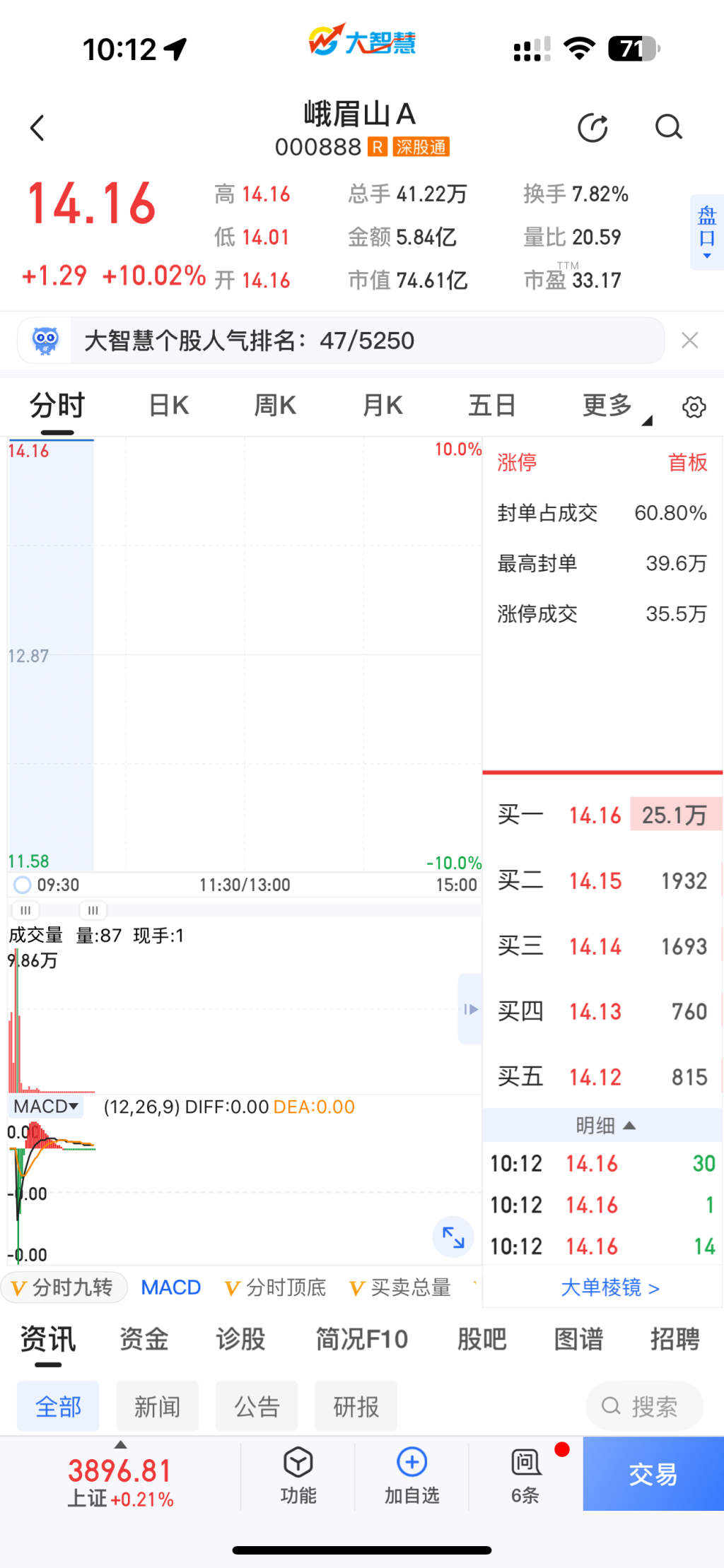 据大智慧VIP数据显示,12月1日A股开盘,峨眉山A一字板涨停,截至发稿报14.16元/股。