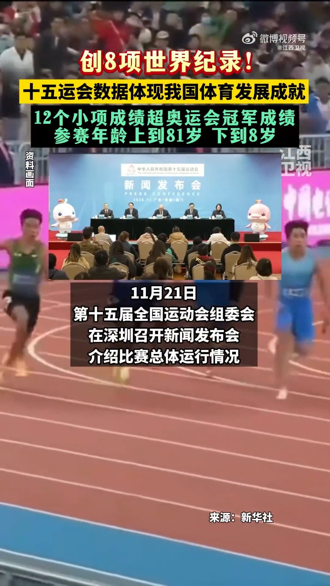 截至11月21日10时,第十五届全运会在田径、游泳、射击、举重、场地自行车、攀岩等有成绩纪录的项目中,创超8项世界纪录、5项世界青年纪录、13项亚洲纪录、10项亚洲青年纪录、14项全国纪录,7项全国青年纪录,全面展示了我国竞技体育发展成就。37个参赛代表团中,有31个代表团获得金牌、35个代表团获得奖牌。详情>>