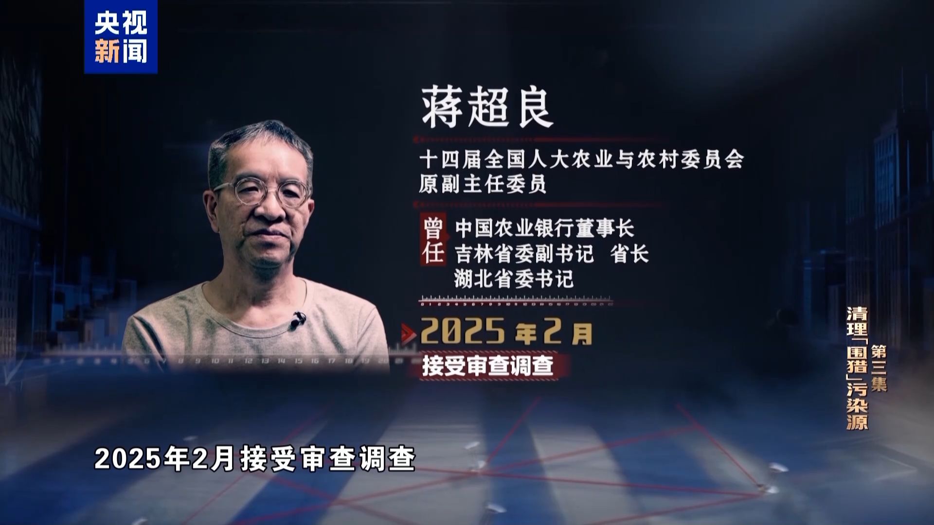 蒋超良,十四届全国人大农业与农村委员会原副主任委员,曾任中国农业银行董事长,吉林省委副书记、省长,湖北省委书记等职务,2025年2月接受审查调查。