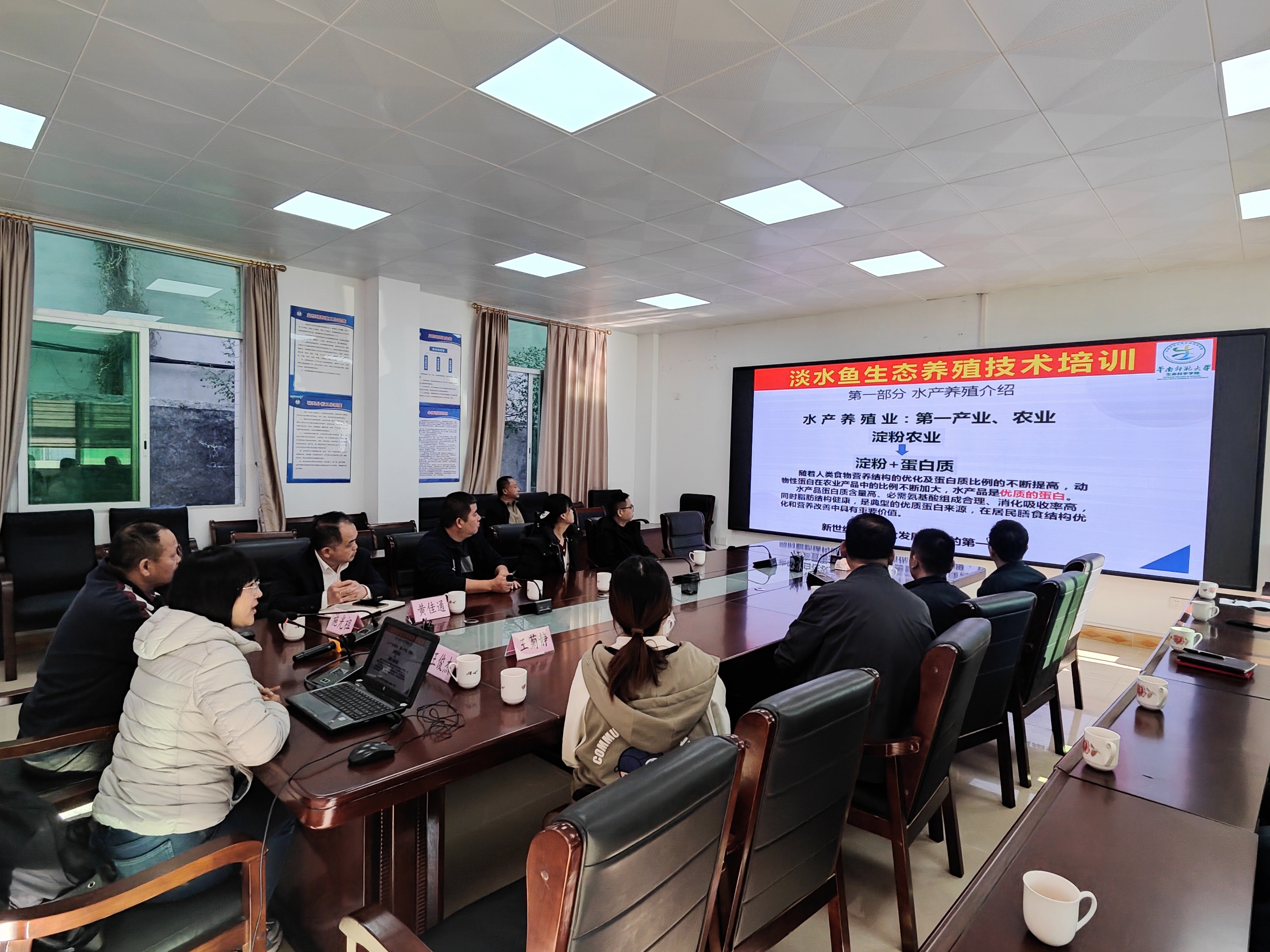 随后,团队在汤西镇人民政府举办淡水鱼生态养殖技术培训会。王俊杰副研究员立足调研发现的共性问题,以“养殖水质精准管理”为核心开展专题授课。他从氨氮、亚硝酸盐、pH值、溶解氧等关键水质指标切入,结合典型案例,深入浅出地阐释了水质变化与鱼类健康、生长速度及养殖效益之间的内在关联,引导养殖户树立“科学管水、以质提效”的生态养殖新理念。