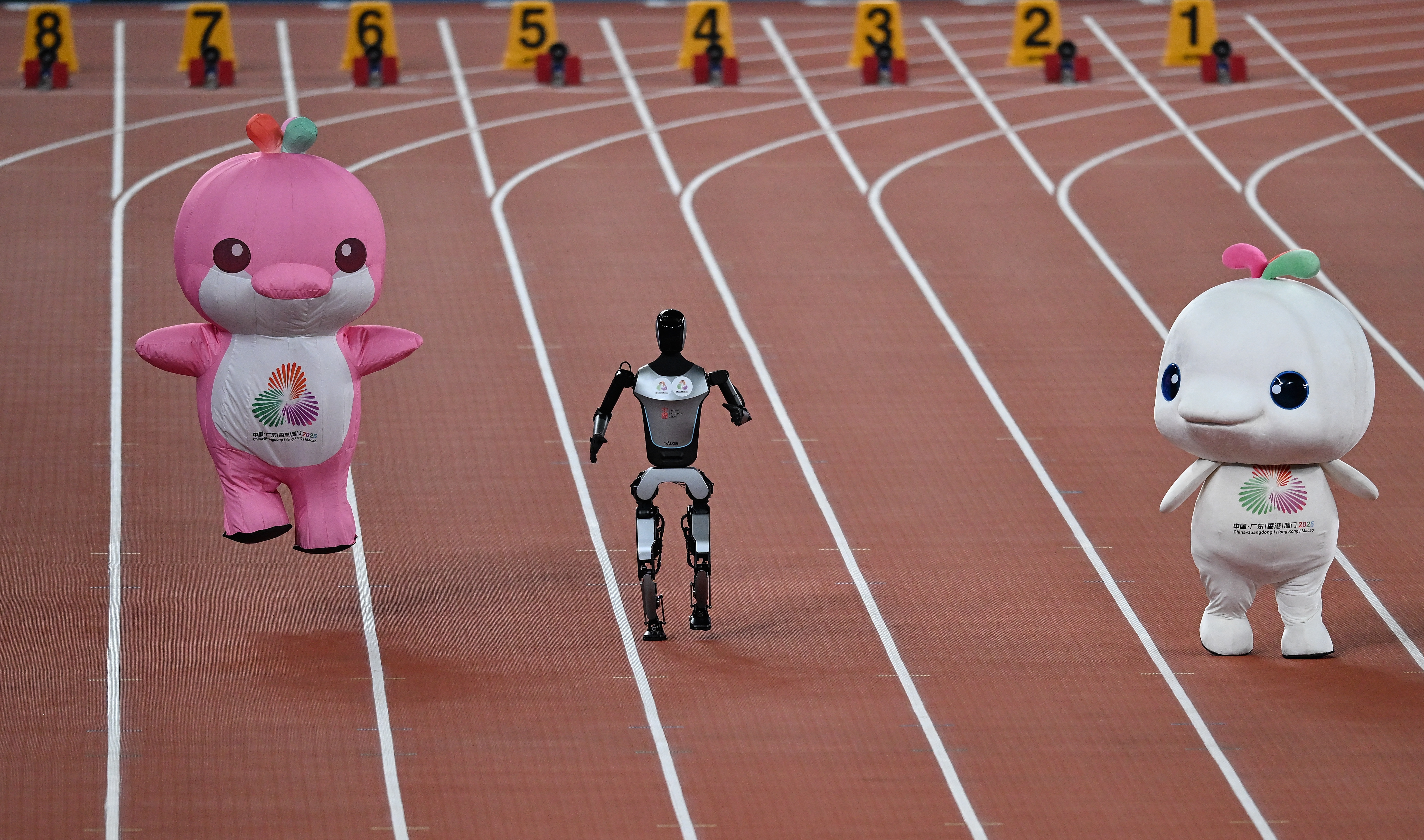 2025年11月17日,在十五运会田径项目赛事开始前的暖场活动中,机器人和吉祥物喜洋洋、乐融融赛跑。新华社记者 周牧 摄