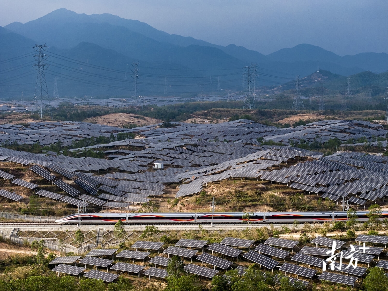 2025年12月22日,广湛高铁开通,列车迎着阳光飞驰在布满光伏发电板的群山间。南方+记者 石磊 摄