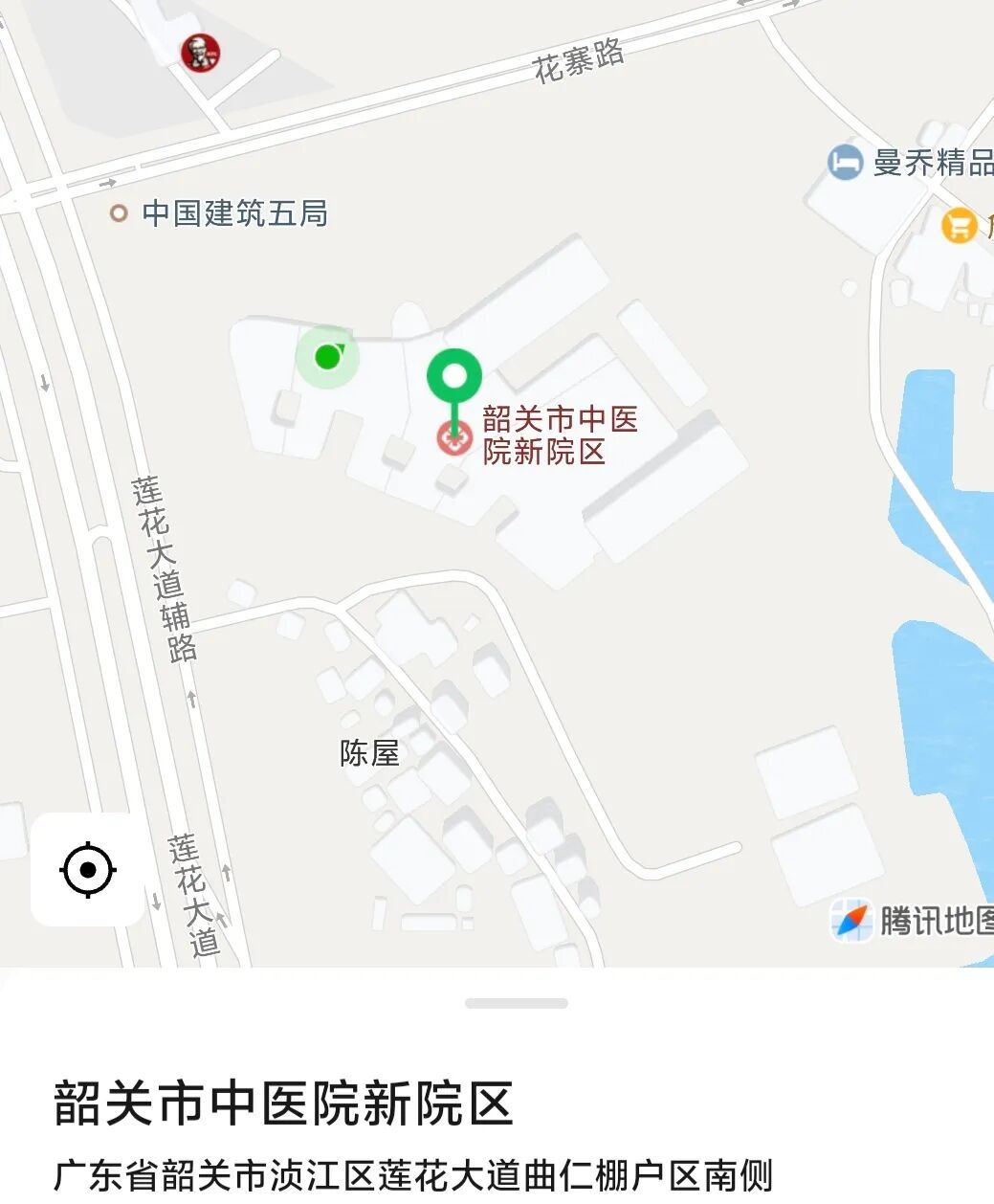 3、自驾出行:导航输入“韶关市中医院(浈江区莲花大道曲仁园南侧)”即可抵达。