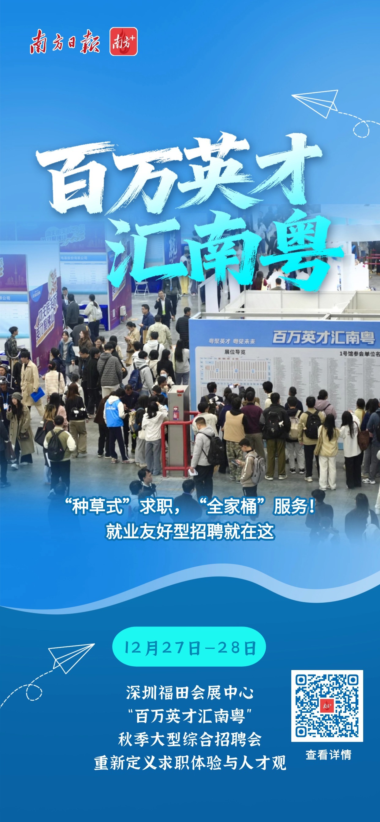 12月27日,“百万英才汇南粤”秋季大型综合招聘会在深圳福田会展中心开幕。一场聚焦就业友好型招聘的创新范式在这里生动展开——从“生态链组团”“老板直聘”,到覆盖求职全流程的“全家桶”服务,传统“海投”模式正被沉浸式、精准化、有温度的“种草”体验所取代。