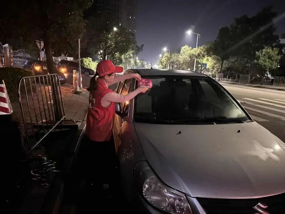 区档案馆党员志愿者在路灯下贴好车辆标识。