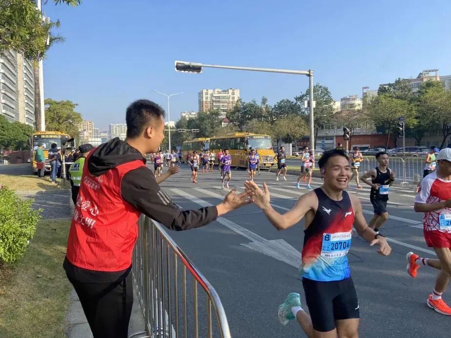 有的志愿者们化身临时环卫工,在赛前赛后深度清洁赛道;靠后路段的志愿者们耐心驻守,直至最后一名跑者安全通过;晨光之下,那一杯杯及时递上的温水,一声声嘶哑却热情的助威,成为了选手们心中最生动的侨乡记忆。