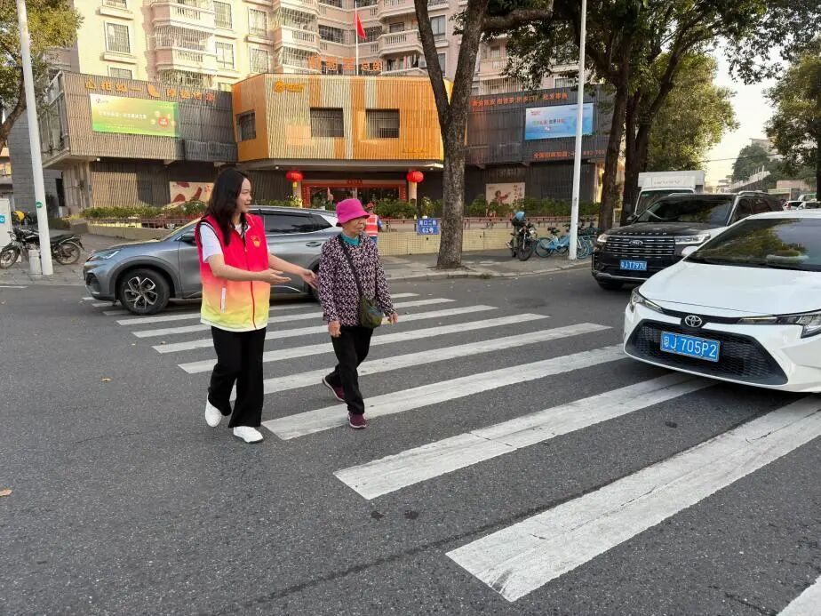 赛道17公里白石大道至港口二路的赛道路段,环市群众社区书记胡晓红帮助腿脚不便的老人家过马路。