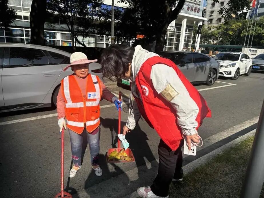 区统计局党员志愿者和环卫工人一起清理赛道垃圾。