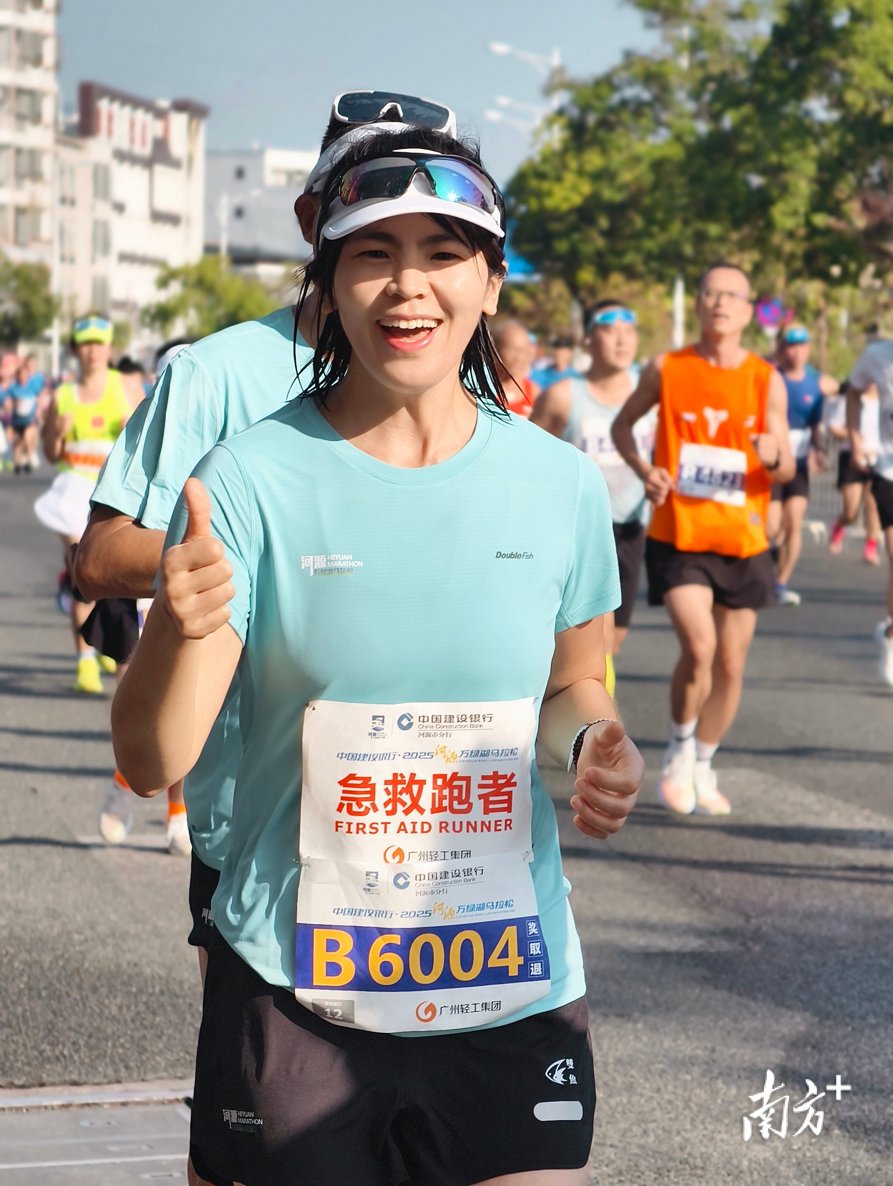 赛场上,除了全力冲刺的参赛选手,还有一群特殊的奔跑者——急救跑者。他们与普通选手同起点、同路线,却不以成绩为目标,而是肩负着守护赛道安全的重任。河源龙凤跑团团长李娜此次担任半程马拉松2小时15分至2小时30分时间段的急救跑者,“不同时间段‘半马’和‘全马’赛道上,都分布着急救跑者的身影。我们虽然也在奔跑,但核心任务是留意赛道上突发情况,用专业的急救技能,为每一位参赛者保驾护航。”