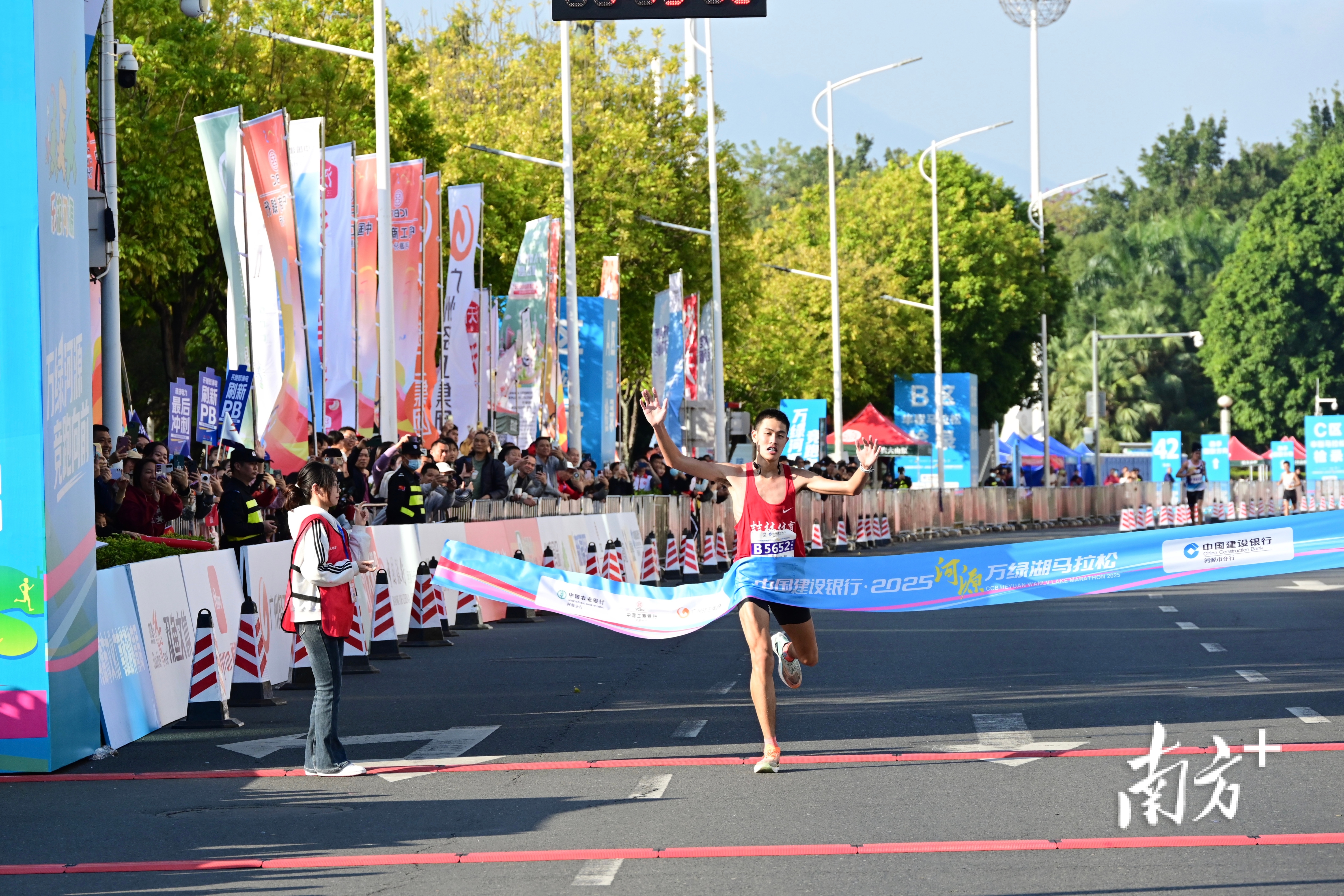 来自佛山的18岁小将何承隆率先冲过终点线,以 1小时13分13秒成绩夺得“半马”冠军。
