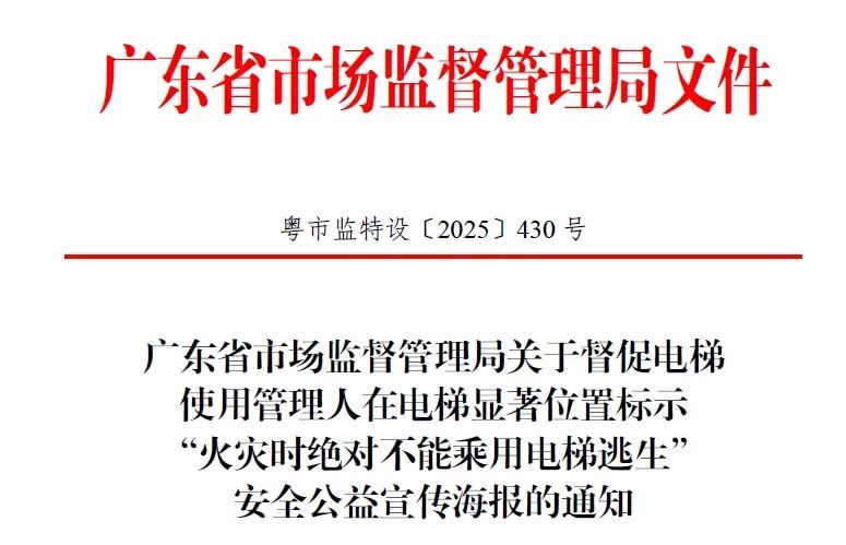 近期,国内火灾时乘用电梯逃生高风险行为时有发生。为有效防范火灾等紧急情况下因乘客误用电梯引发的安全风险,省局统一设计了“火灾时绝对不能乘用电梯逃生”公益宣传海报(https://pan.baidu.com/s/1Rafw5RipVpax8p6OYU8dxg?pwd=v4ij 提取码: v4ij)。根据《广东省电梯使用安全条例》第九条第(四)项规定,电梯使用管理人要“在电梯的明显位置标明……警示标志、安全注意事项”,现就相关事项通知如下。